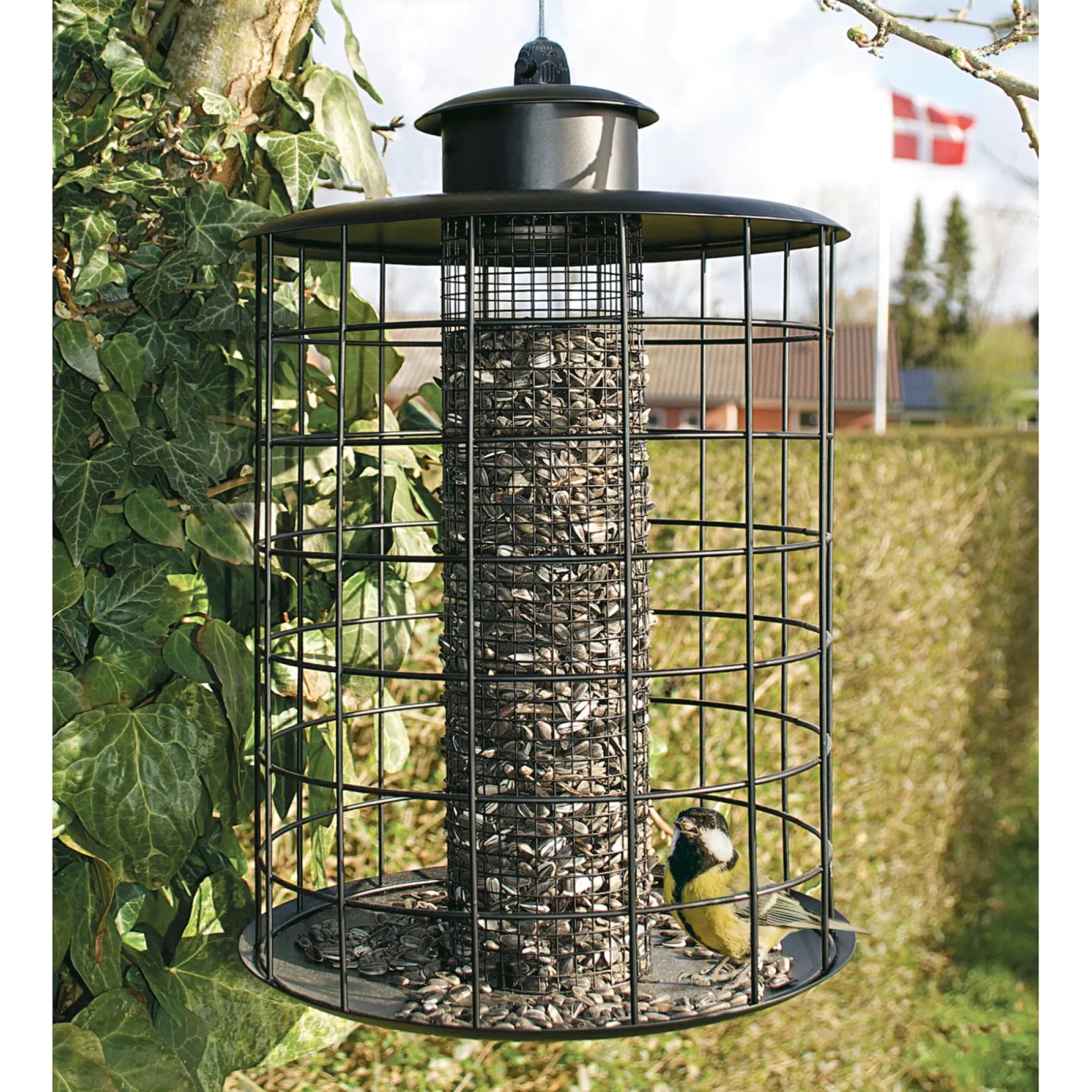 Foderautomatens yderste gitter sikrer, at småfuglene kan spise i fred og foderet ikke spises af større fugle.