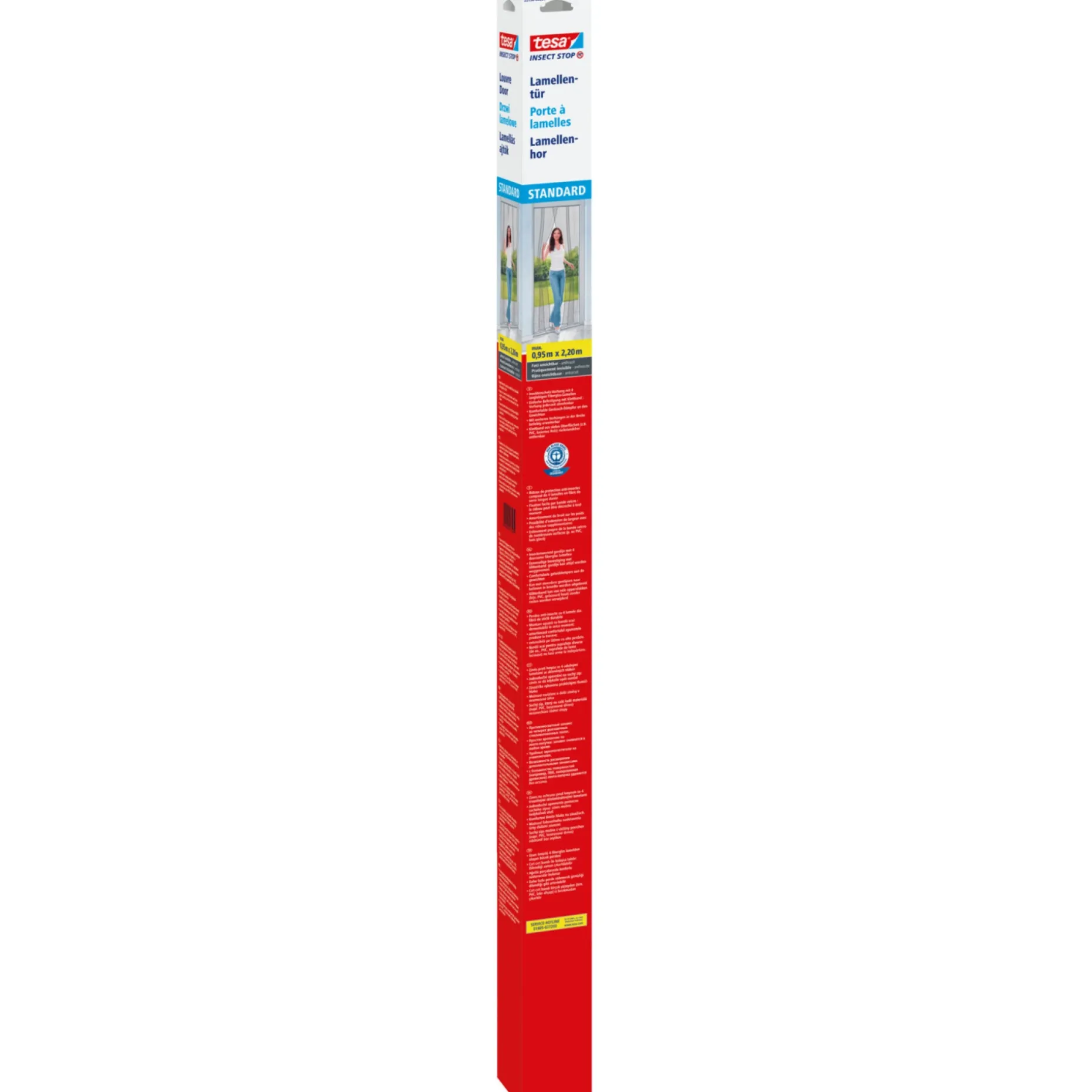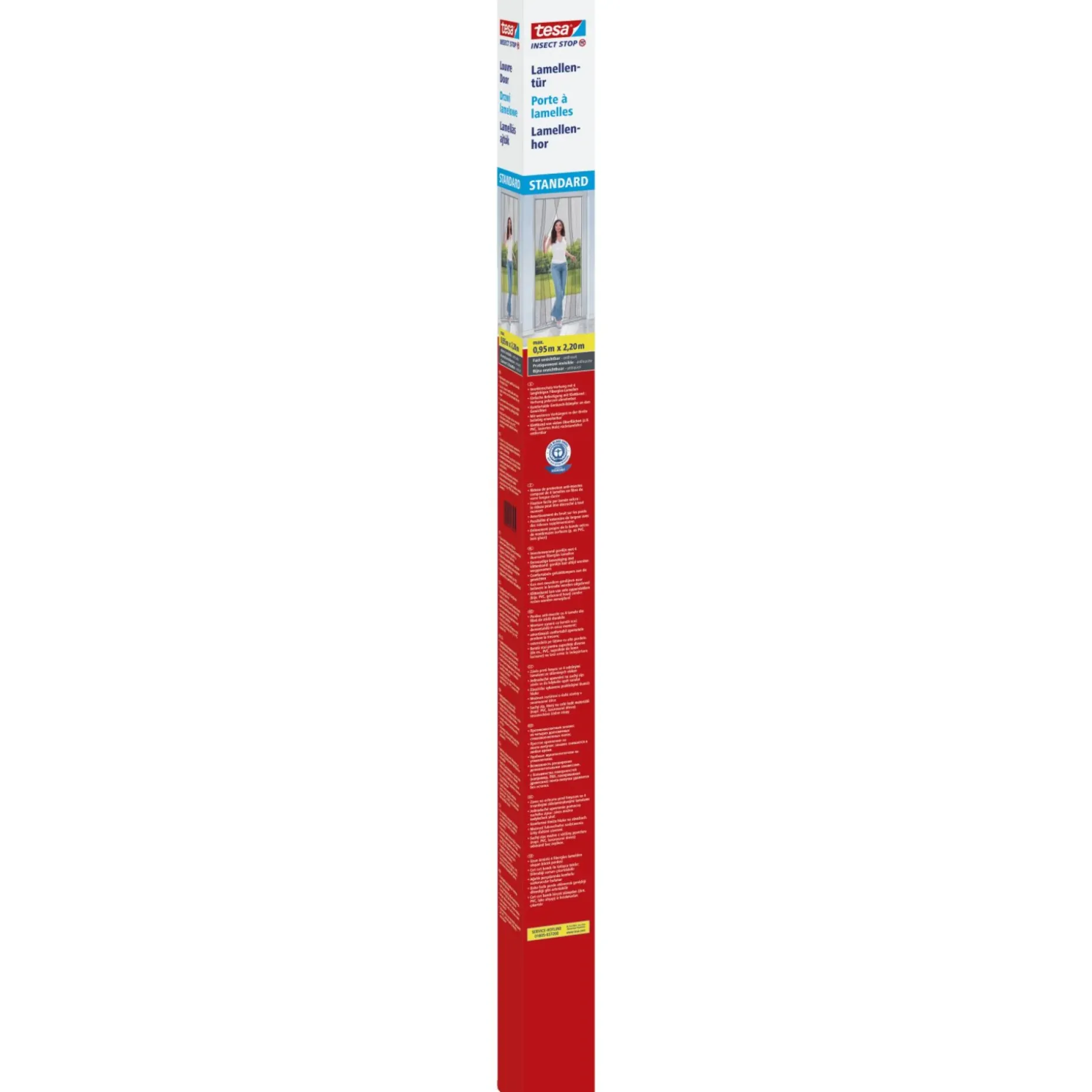 tesa® Insect Stop Insektnet Lamel Standard til døre er en meget effektiv løsning til havedøre, altandøre og franske døre. Lamel Standard består af slidstærke lameller, der overlapper hinanden, så de holder myg, fluer og andre insekter effektivt ude, mens du selv nemt kan gå gennem døren. Burretapen sættes op i strips og gør det hurtigt og enkelt at sætte nettet op. Det er ikke nødvendigt at bore huller i dørrammen.