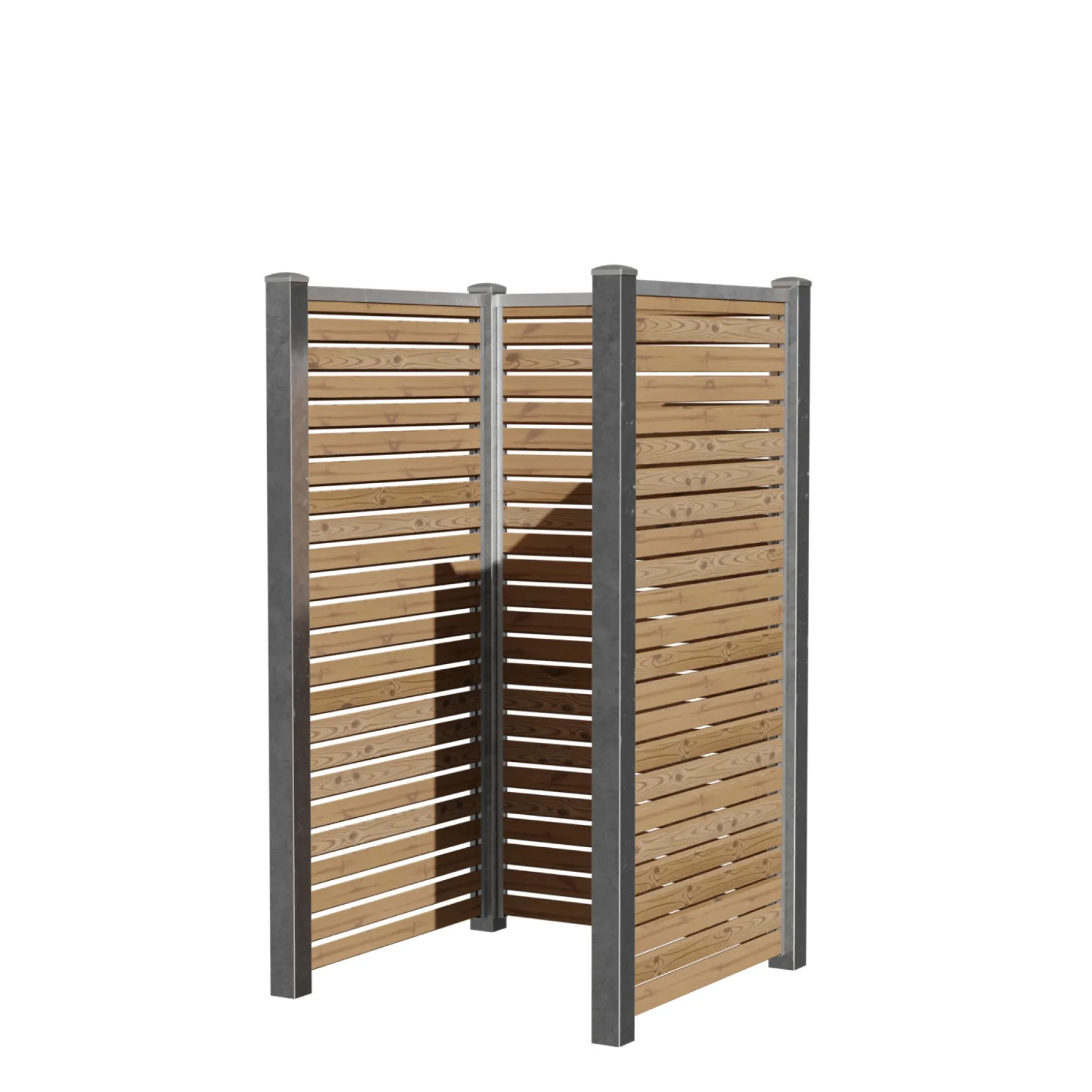 Gør dit udendørs bruseområde til et privat og stilfuldt tilflugtssted med en afskærmning fra Wimex. Afskærmningen er en høj, åben model med tre sider, designet til at give læ og privatliv ved udebruseren. Konstruktionen består af varmgalvaniserede stolper og beklædning i termotræserien Trend Classic med Rombe-profil. Den fremstår med et varmt træudtryk og en tydelig profilering, hvor en afstand på 17 mm mellem brædderne sikrer luftgennemstrømning samtidig med afskærmning. Afskærmningen måler 107 cm i bredden og 191 cm i højden, hvilket gør den velegnet til både mindre og mellemstore udendørs bruseområder. Den tre-sidede, høje opbygning afgrænser pladsen uden at lukke den fuldstændigt, så funktion og æstetik går hånd i hånd. Designet er velegnet til integration i terrasse- eller havedesign, hvor termotræets finish kan supplere øvrige træoverflader. Afskærmningen tilbyder en enkel og klar løsning til at skabe et privat bruseområde med et stilrent udtryk. Rombe-profilen giver et moderne, rytmisk udtryk, som kan supplere både klassiske og moderne udemiljøer. Afstand på 17 mm mellem brædderne bevarer luftcirkulation og sikrer et diskret skærmende udseende uden at mørklægge området.