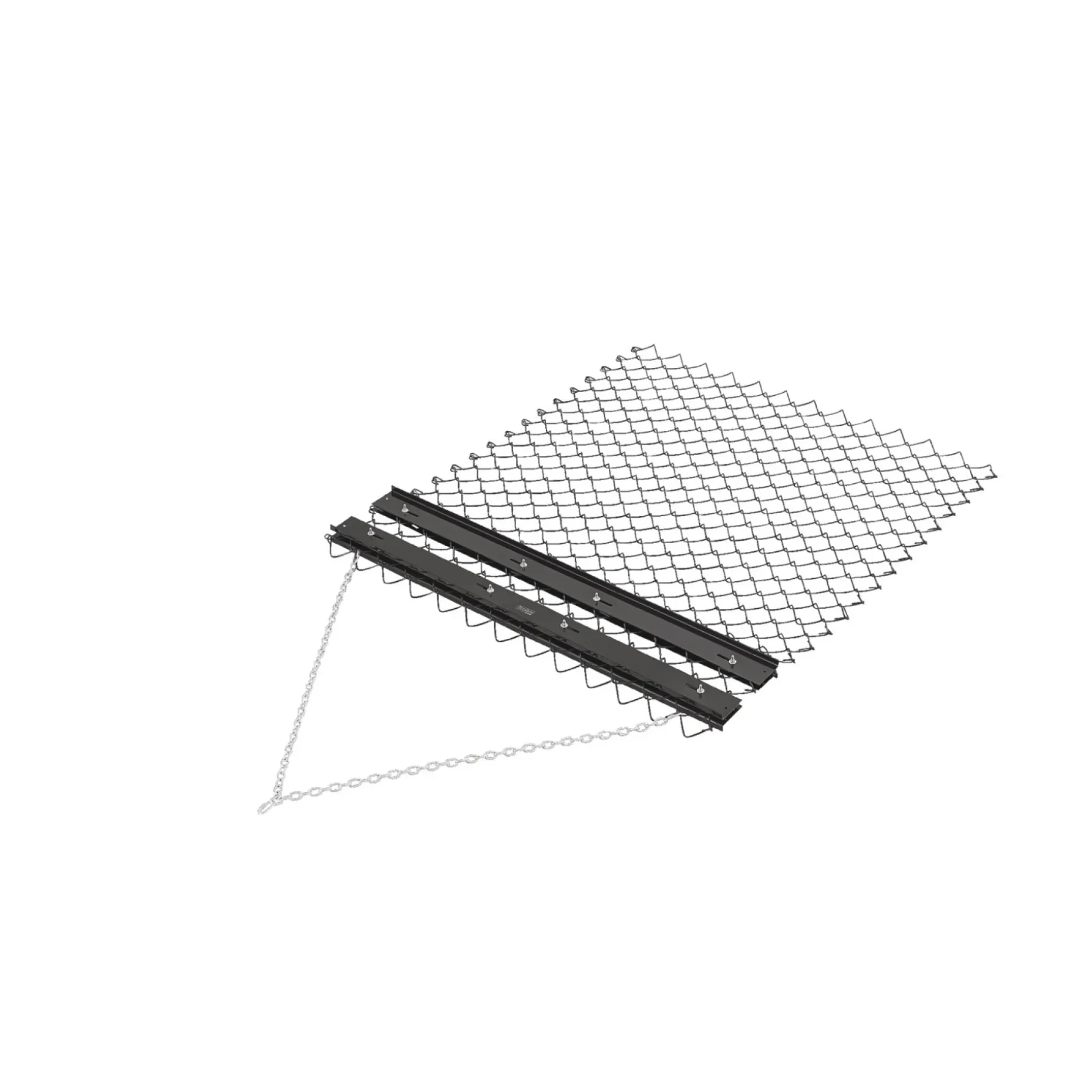 Harvenet med trækkæde til at montere efter havetraktoren, eller ATV’en. Bruges på grus- og jordarealer til udjævning: gårdsplads, muldvarpeskud, ridebane og lignende. Ekstra vægt, f.eks. passende sten, kan lægges på de tværgående skinner. 120×150 cm (bredde x længde).