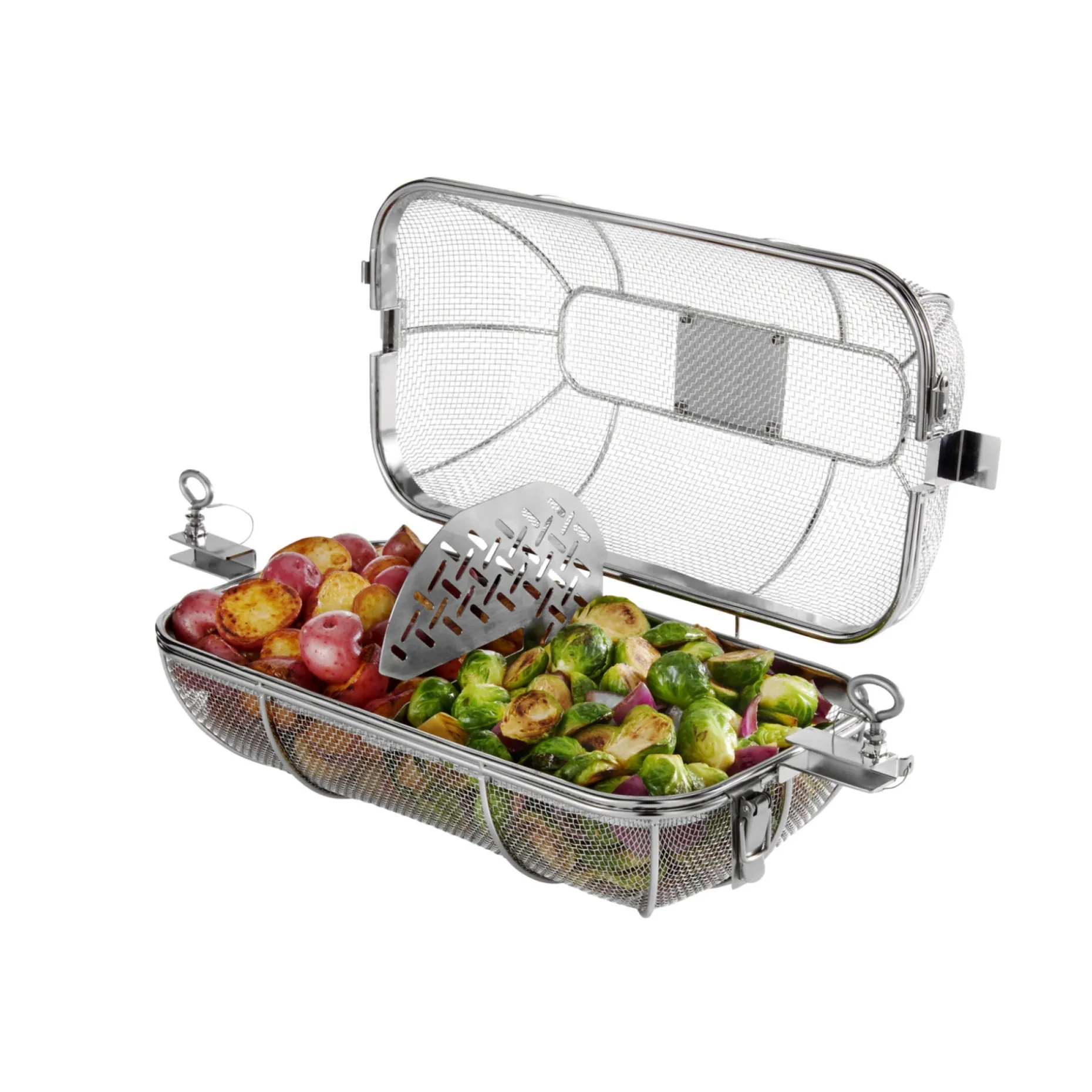 Kurven passer til rotisseri og sættes nemt på rotisserispyddet, så du hurtigt kan komme i gang med tilberedningen. Finmaskerne sikrer, at varmen kan fordele sig og skabe en sprød overflade på råvarerne.