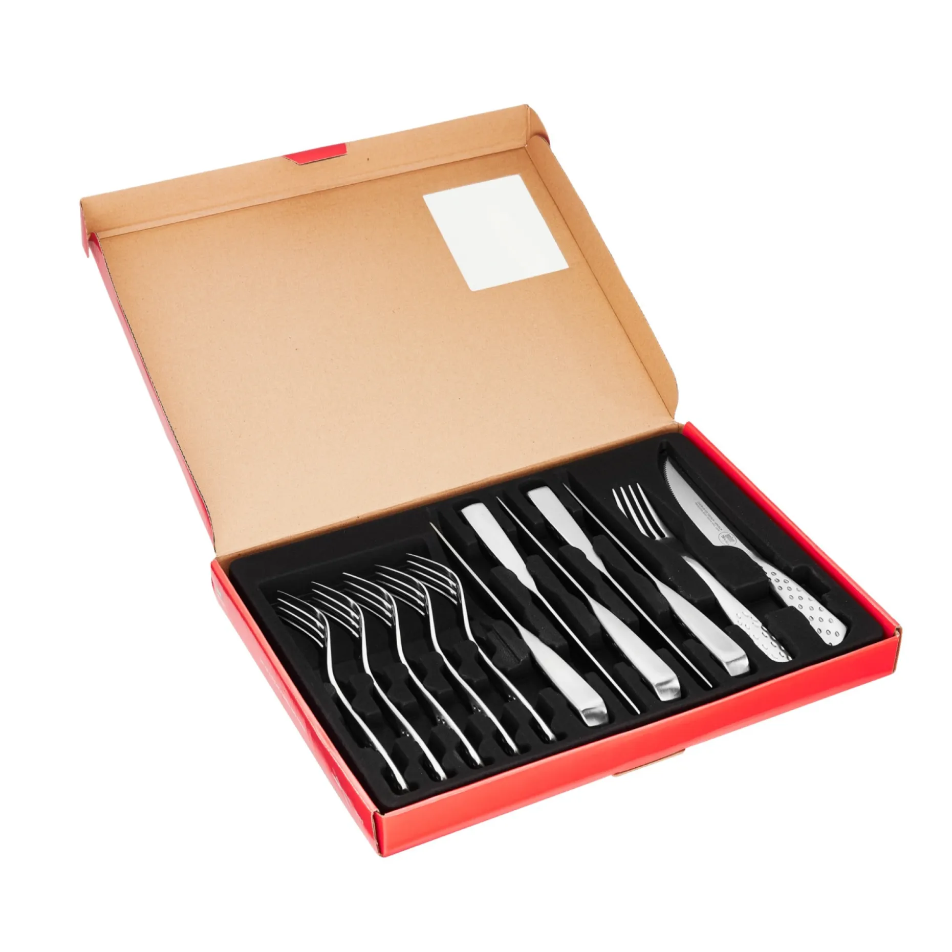 Seks skarpe steakknive og seks gafler med en længde på 36 cm i eksklusivt design af gedigent, tysk kvalitetsstål. Sættet er skabt til at løfte serveringen ved middage og grillfester; det giver et professionelt indtryk, når steg, kylling eller kalkun skæres og deles for gæsterne. Knivenes skarphed og gaflernes længde gør det nemmere at fastholde og skære kød præcist, samtidig med at borddækningen fremstår elegant.