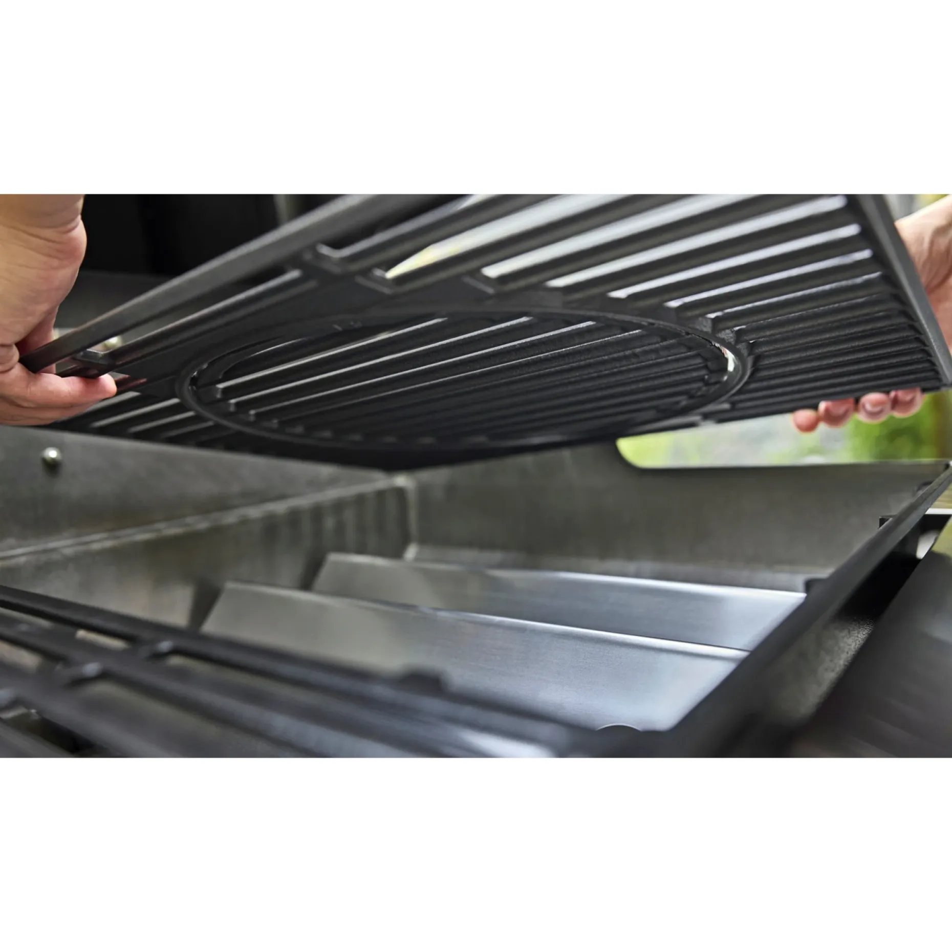 - Plads til Weber Works drop-in-tilbehør i sidebordet og snap-on-tilbehør på sideskinner. Begge dele er også tilkøb.