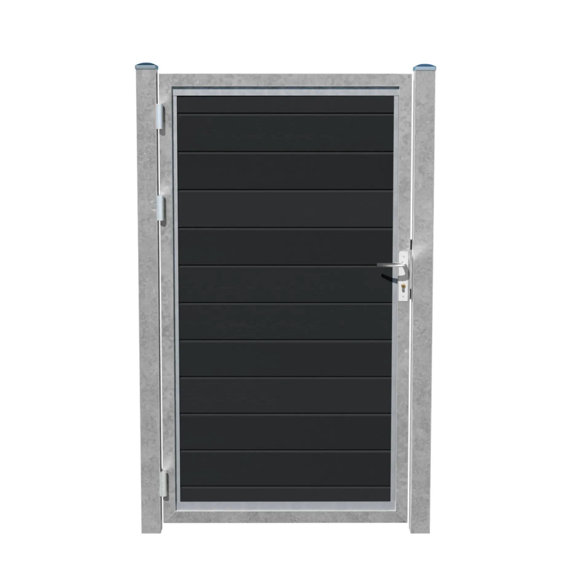 Lågen fungerer som et visuelt element i haven med en moderne koksgrå finish, der matcher mange hegnstyper.