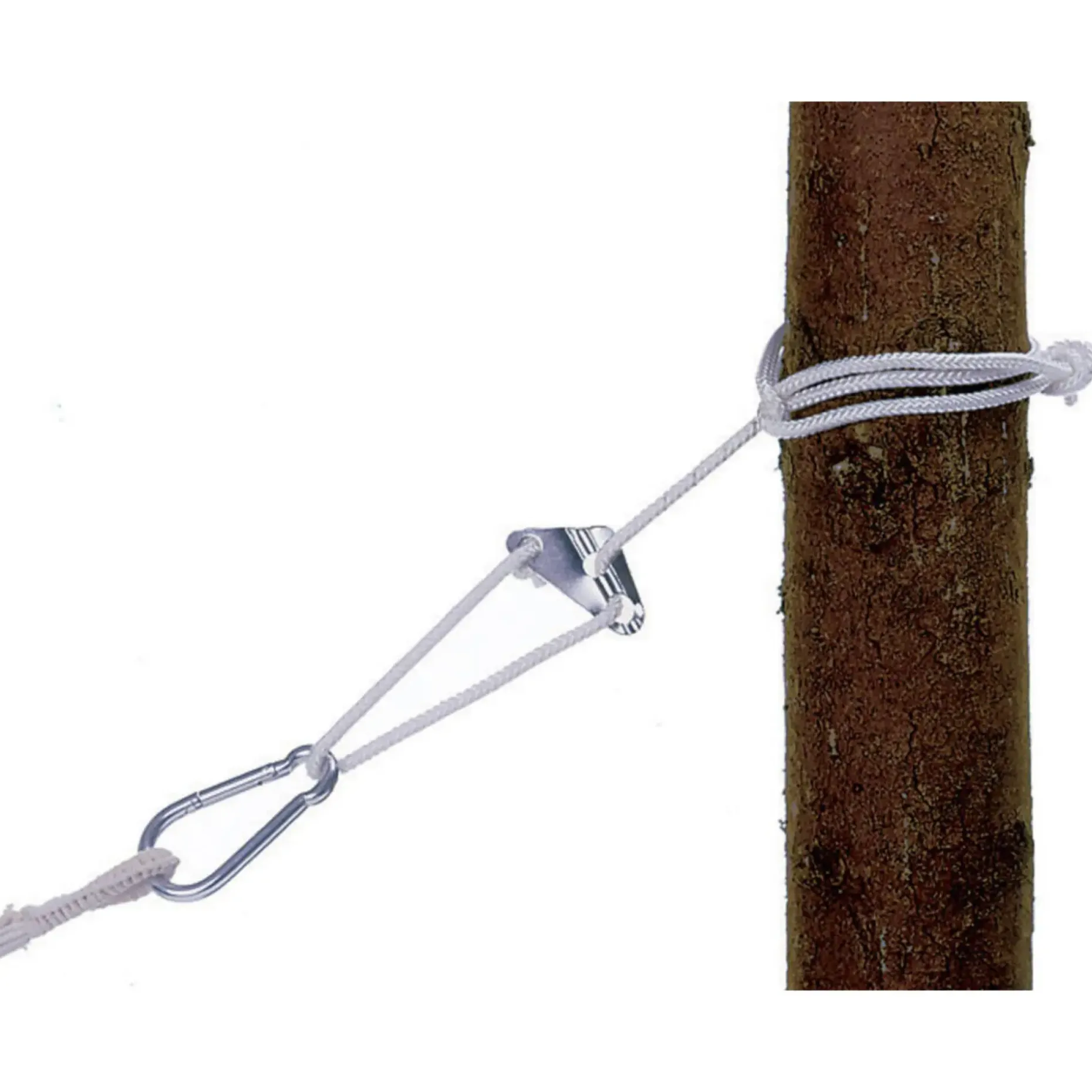 Anvend rebet sammen med passende vægkroge eller ophængspunkter, så belastningen fordeles korrekt. Karabinhagen giver hurtig kobling til kroge eller træstammer, mens opstrammeren bevarer den ønskede spænding uden knuder. Velegnet til udendørs ophæng.