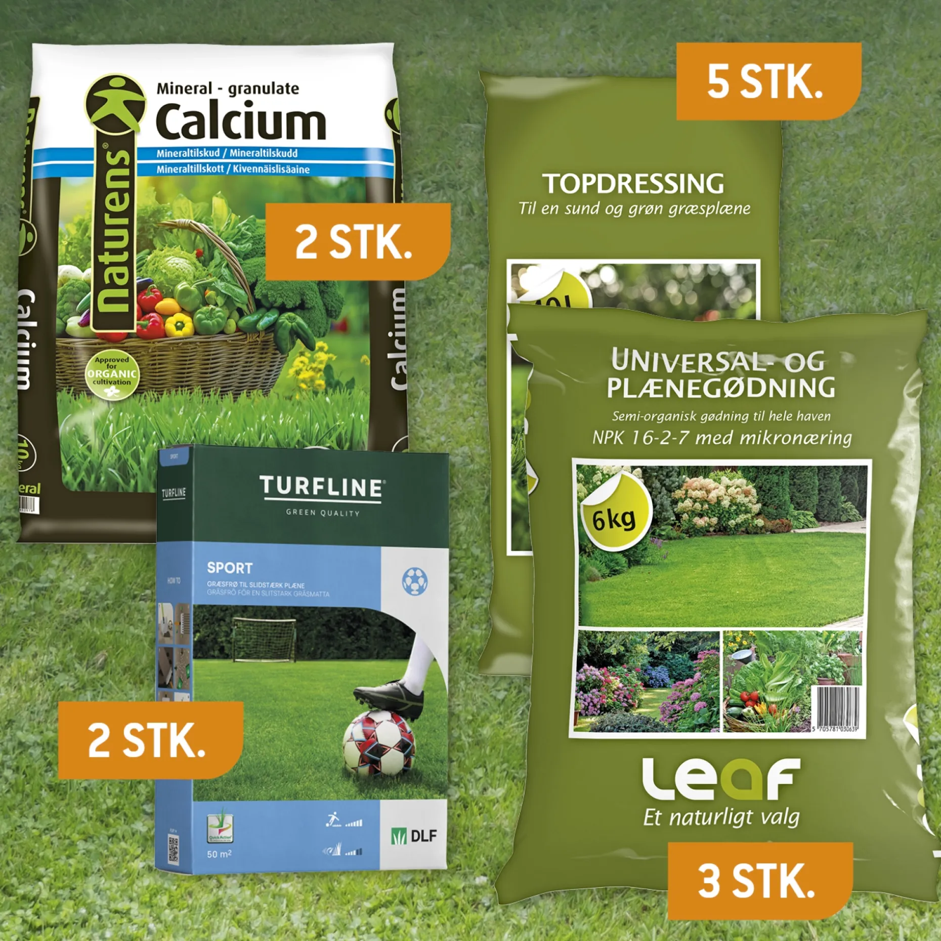 Naturens Perlekalk i sættet bidrager til at forberede jorden, Leaf Semi-organisk gødning sikrer tilførsel af næringsstoffer over tid, Turfline Sport græsfrø giver frø til genetablering, og Leaf Topdress bruges til udligning og forbedring af overfladen.
