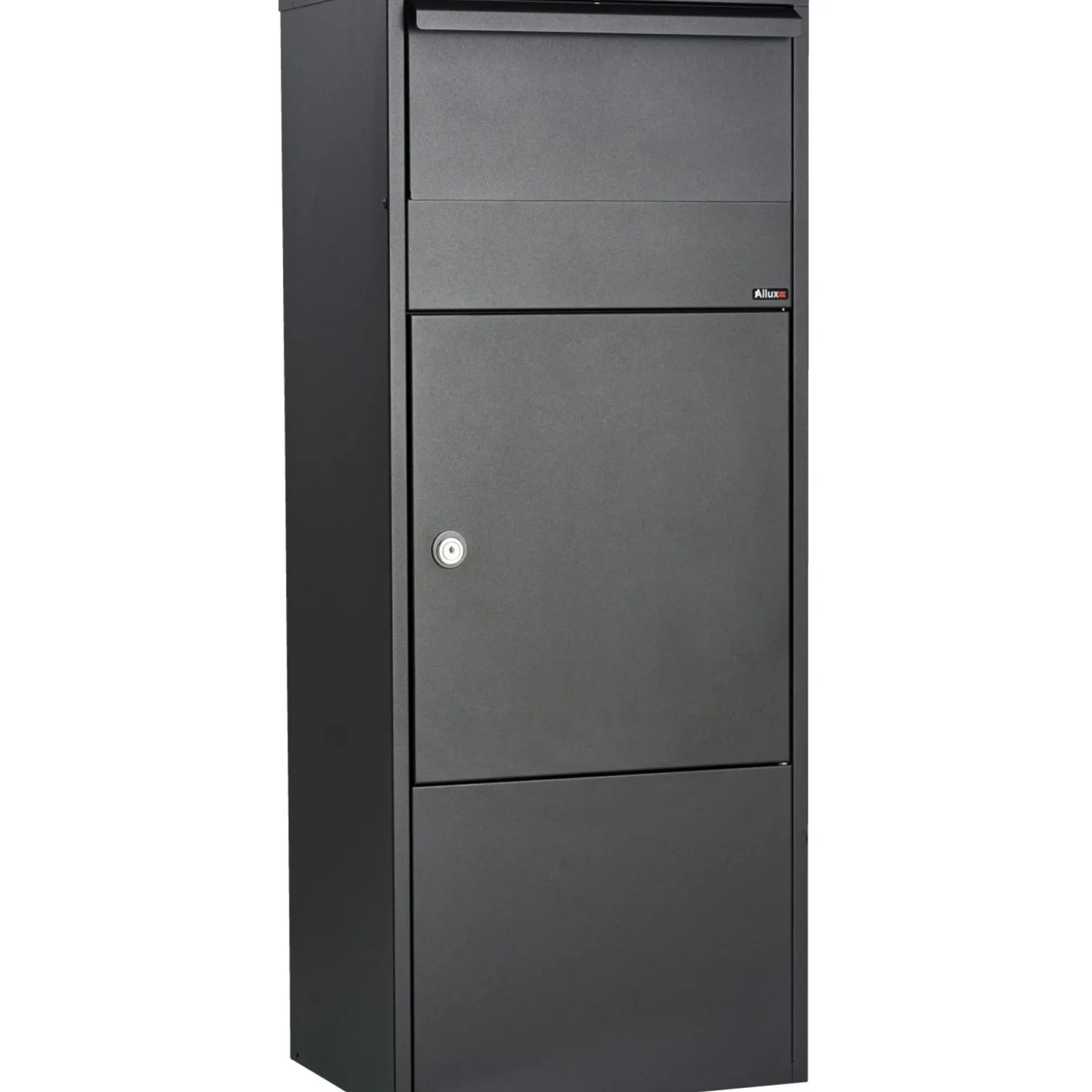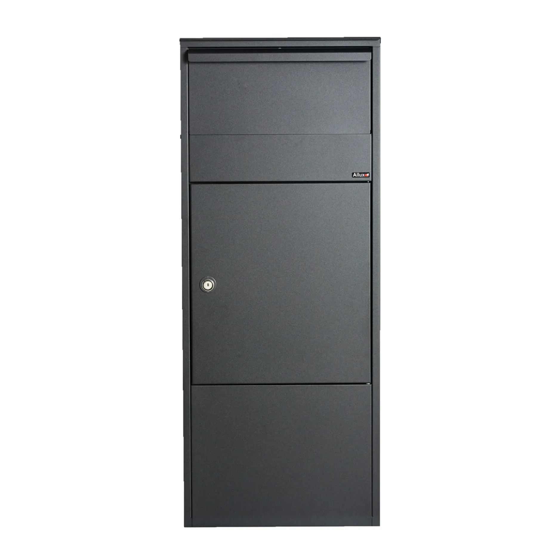 Allux pakkepostkasse 800S er en traditionel, stor og rummelig pakkepostkasse i sort, fremstillet i galvaniseret pulverlakeret stål.