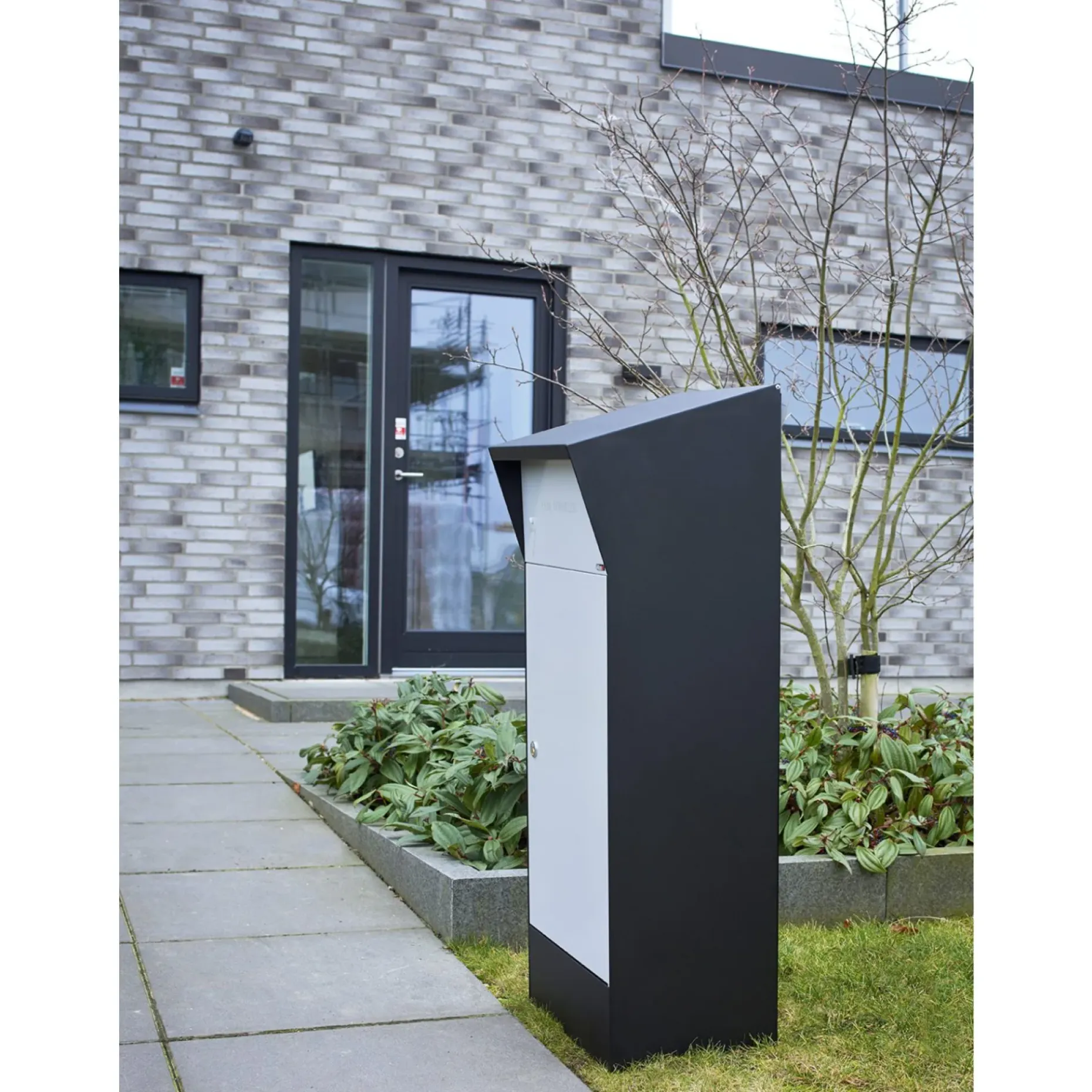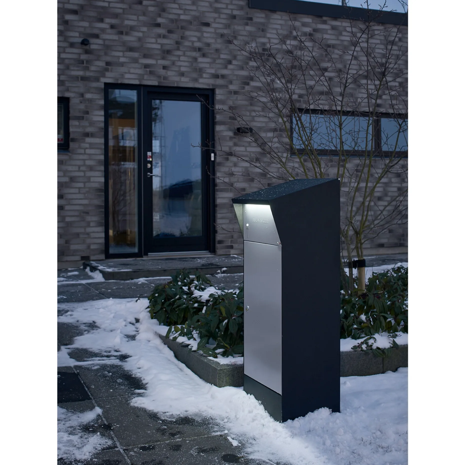 Pakkepostkasse med LED belysning, som er designet af Christian Bjørn og fremstillet i kraftig pulverlakeret galv. Stål med Rukolås 6 stift.. LED lysindstilling af tid og skumring.