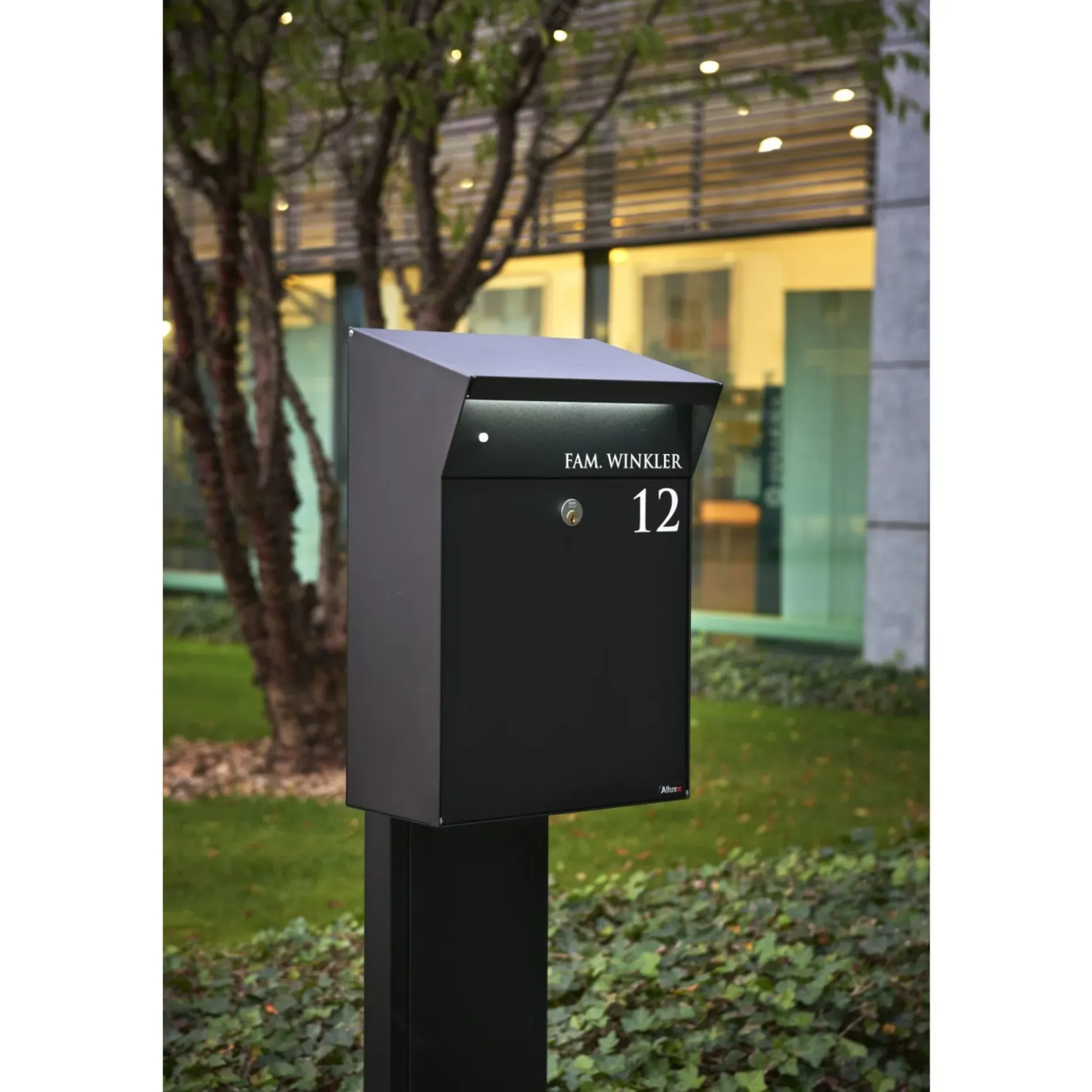Postkasse med LED belysning, designet af Christian Bjørn. Fremstillet i kraftig pulverlakeret galvaniseret stål med Ruko lås. LED lysindstilling af tid og skumring.