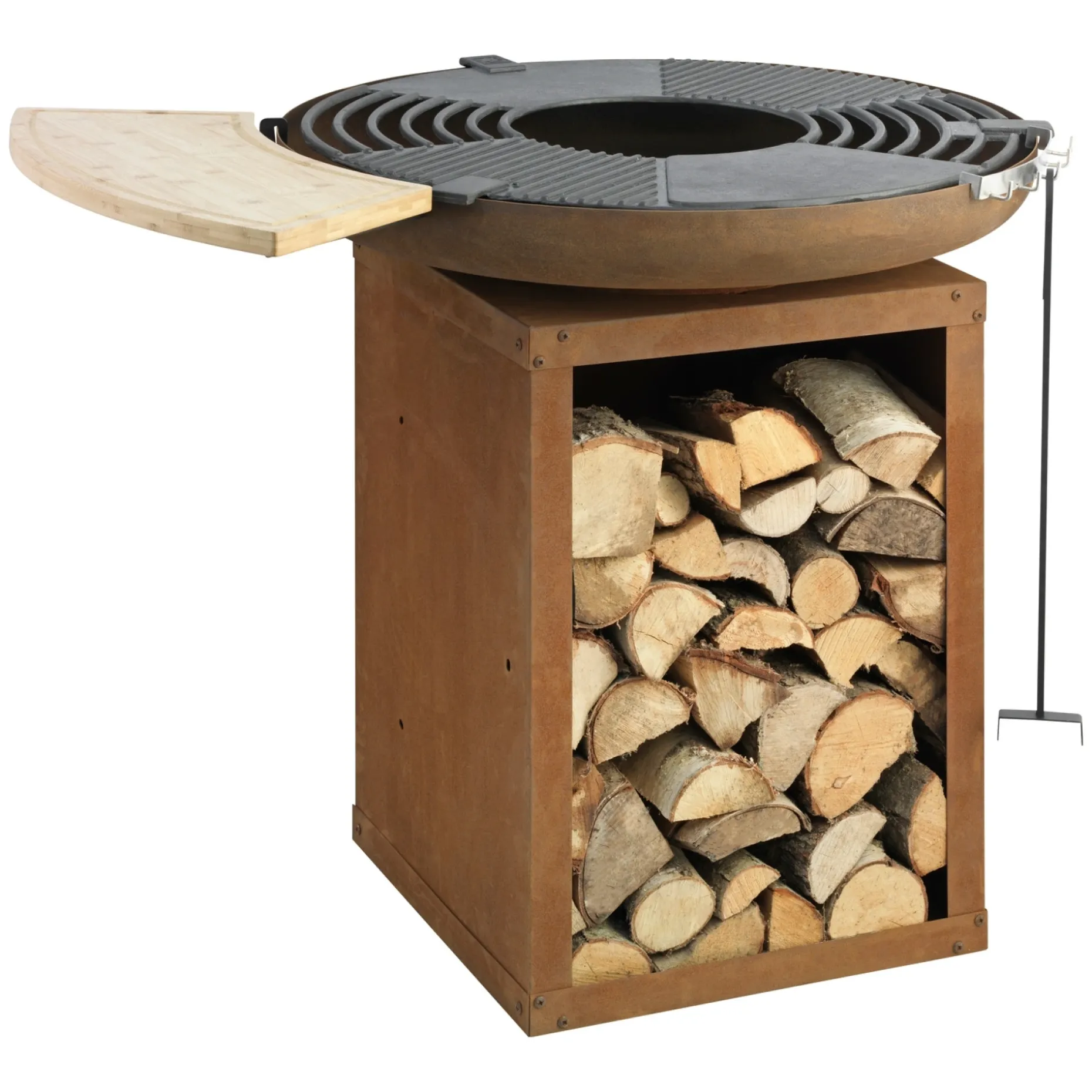 Den aftagelige rist gør det nemt at flytte maden væk fra gløder eller at tilføje brænde. Skærebrættet og redskabsholderen holder ingredienser og redskaber tæt ved arbejdsfladen.