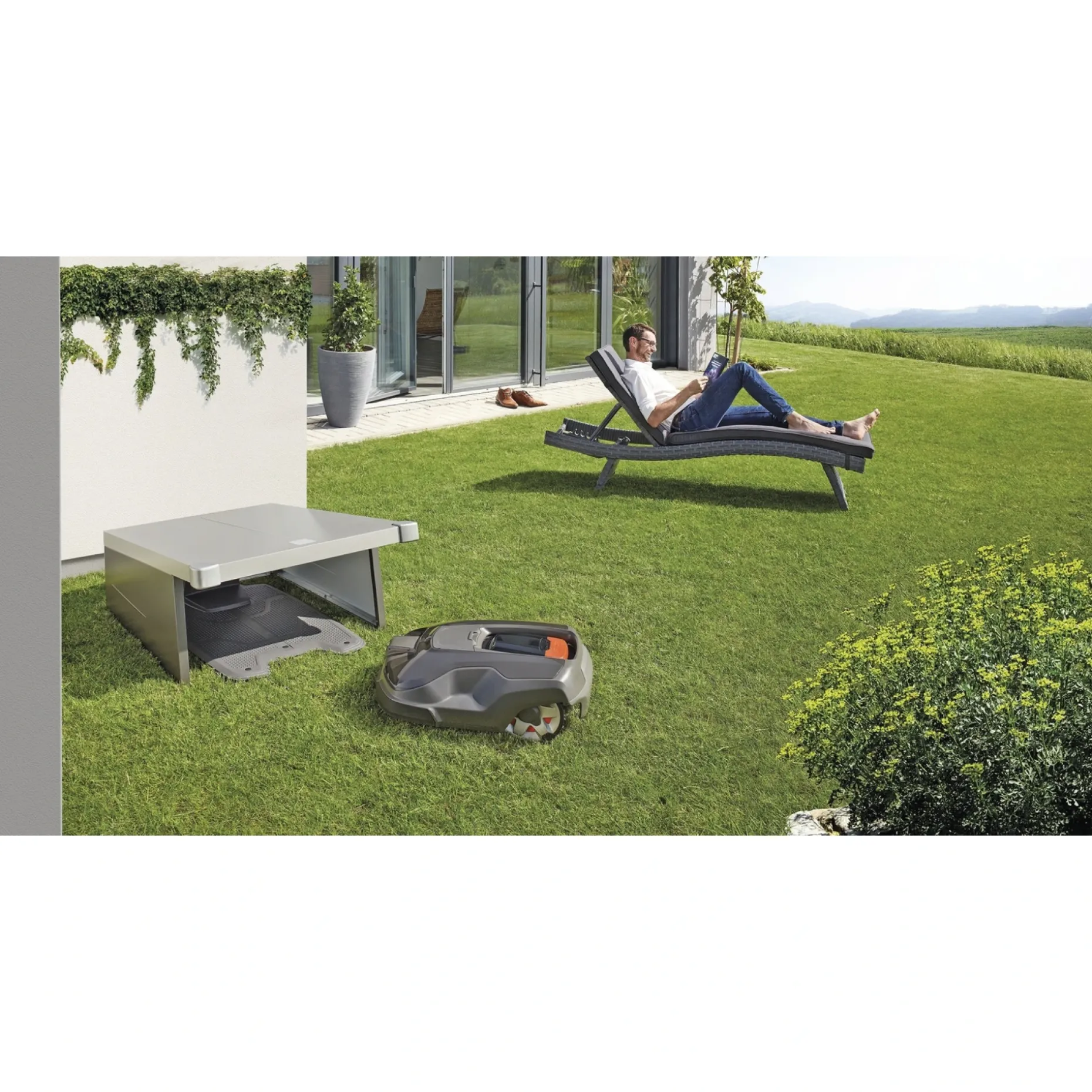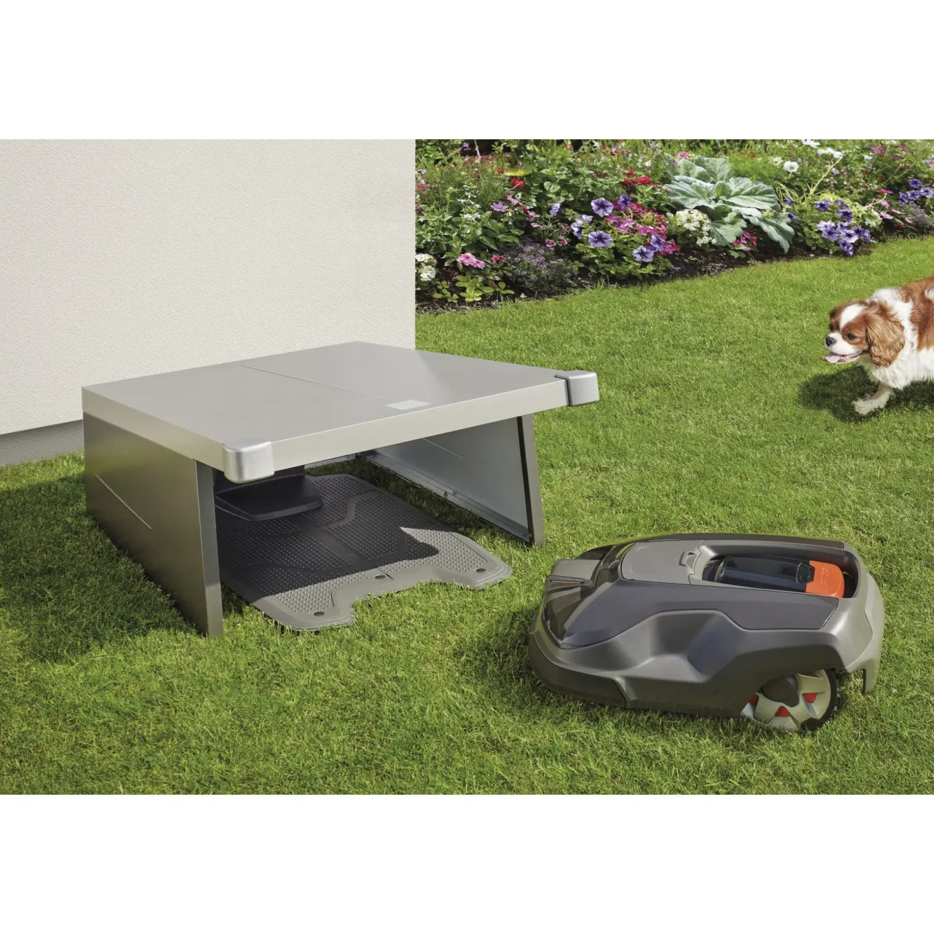 Garagens konstruktive udformning beskytter robottens betjeningspanel og elektronik mod direkte regn og nedbør, og skaber et tørt opbevaringssted mellem klipninger.