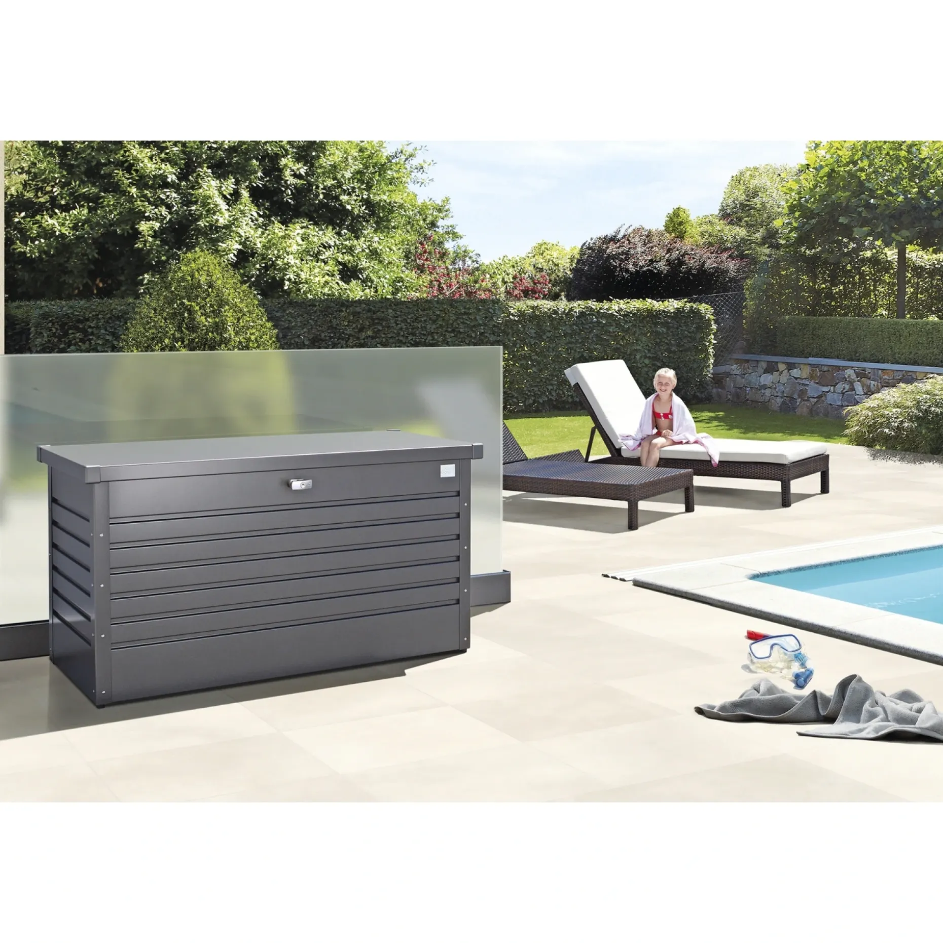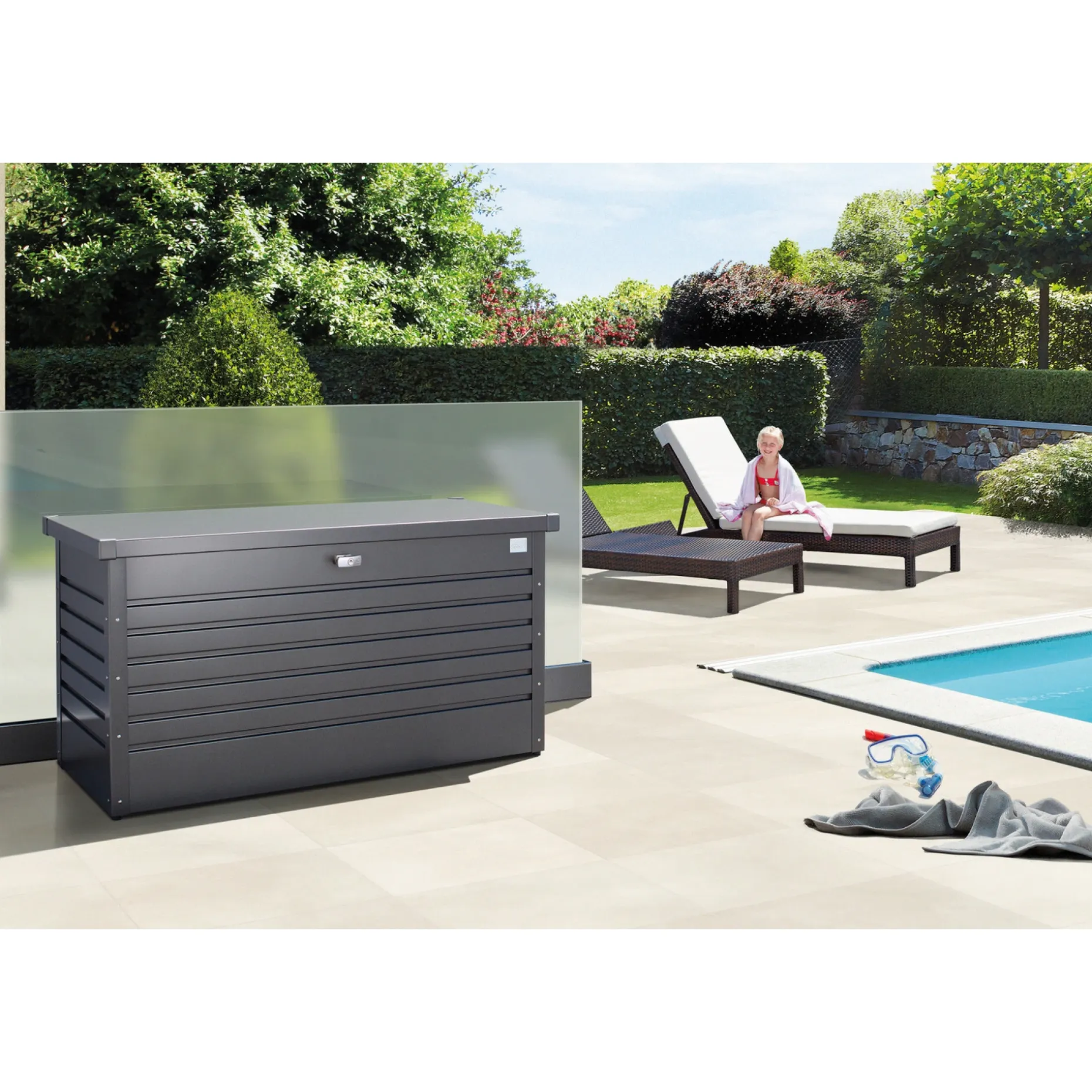 Boksen har usynlig og integreret ventilation, som sikrer frisk luft indvendigt. Den rummer ca. 460L og er velegnet til opbevaring af havehynder, udstyr til camping eller sport samt andre genstande, der kræver et tørt sted.