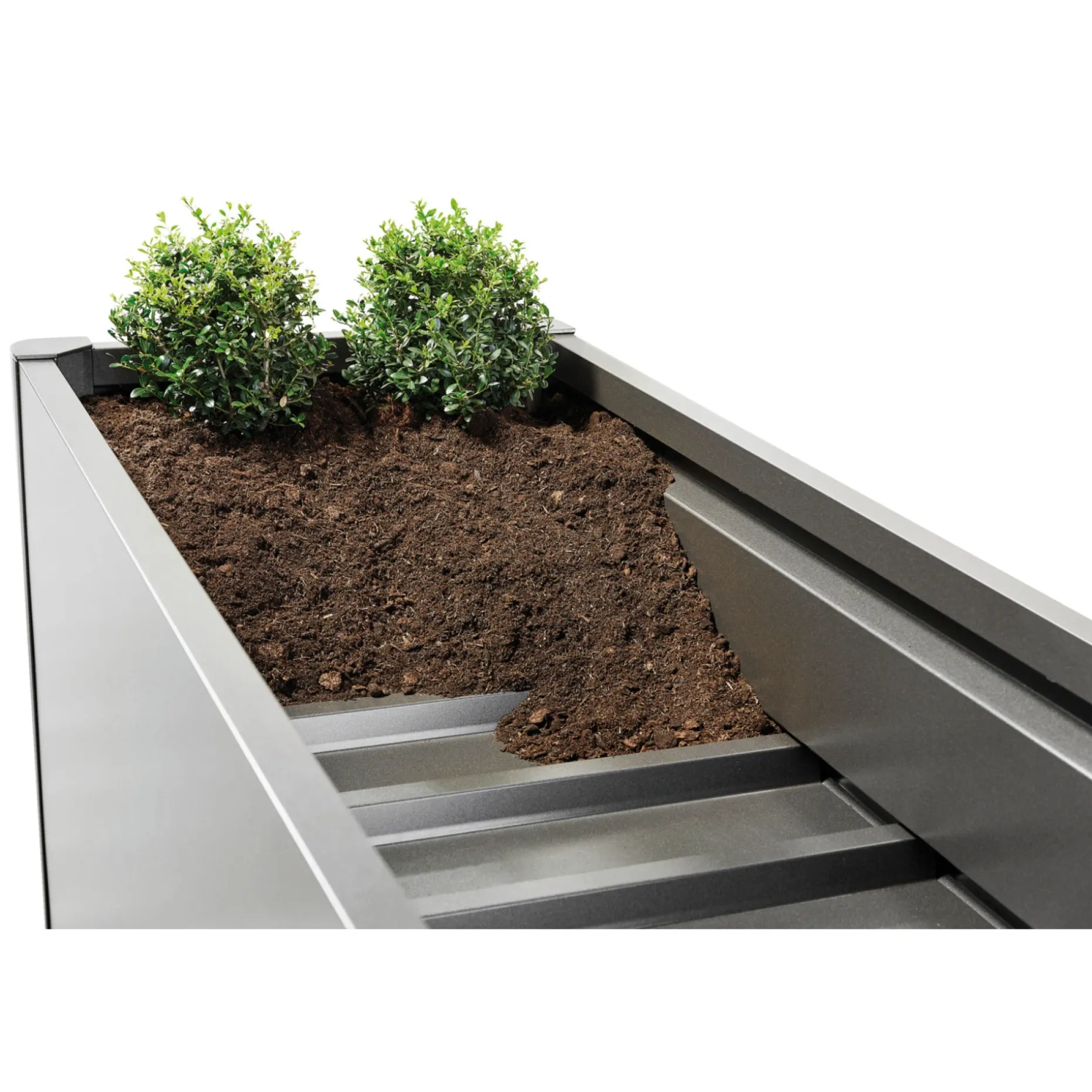 Modellen leveres i mørkegrå metallic, en farve når hylden skjules under jordlaget. Valget af hylde gør det muligt at skabe symmetriske højbed uden at øge ydre mål, så indretning og design bevares samtidig med, at du sparer jord.