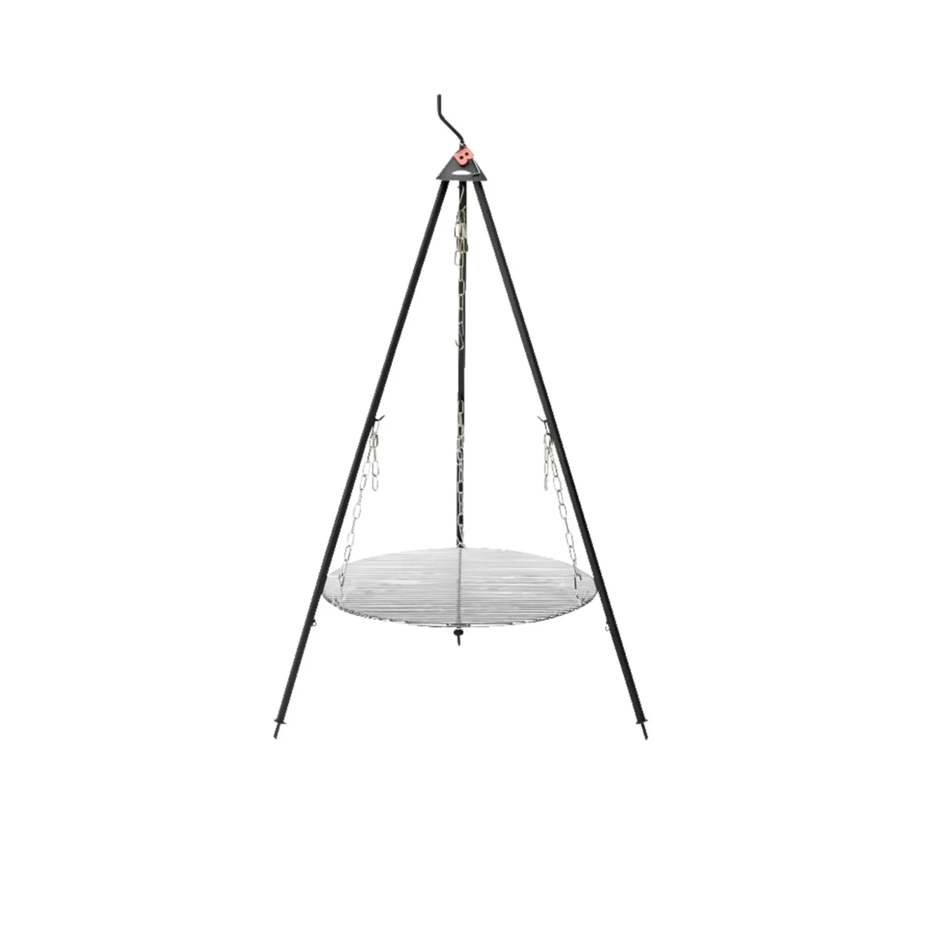Grillristens Ø60 cm giver plads til gryde eller pande og kan justeres i højden ved hjælp af de tre kæder. Sættet henvender sig til private gør-det-selv’ere og alle, der ønsker fællesskab omkring madlavning over åben ild.