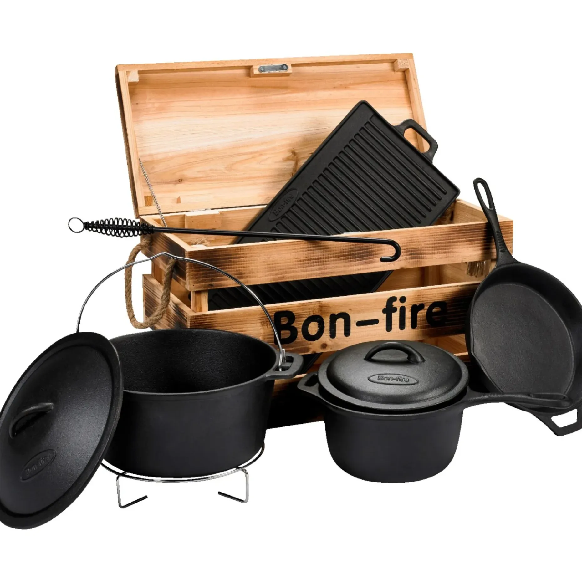 Bon-fire Støbejernssæt leveres i en sort trækasse og er sammensat til udendørs madlavning over åben ild.
