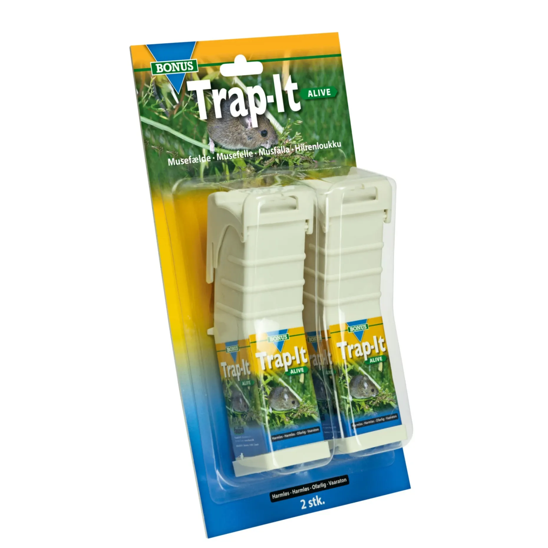 BONUS 2 stk. musefælde er en levendefælde i plast, der fanger musen levende. Placer fælden med klappen åben, så klappen hviler på underlaget. Anbring lidt lokkemad forrest og bagerst i fælden.