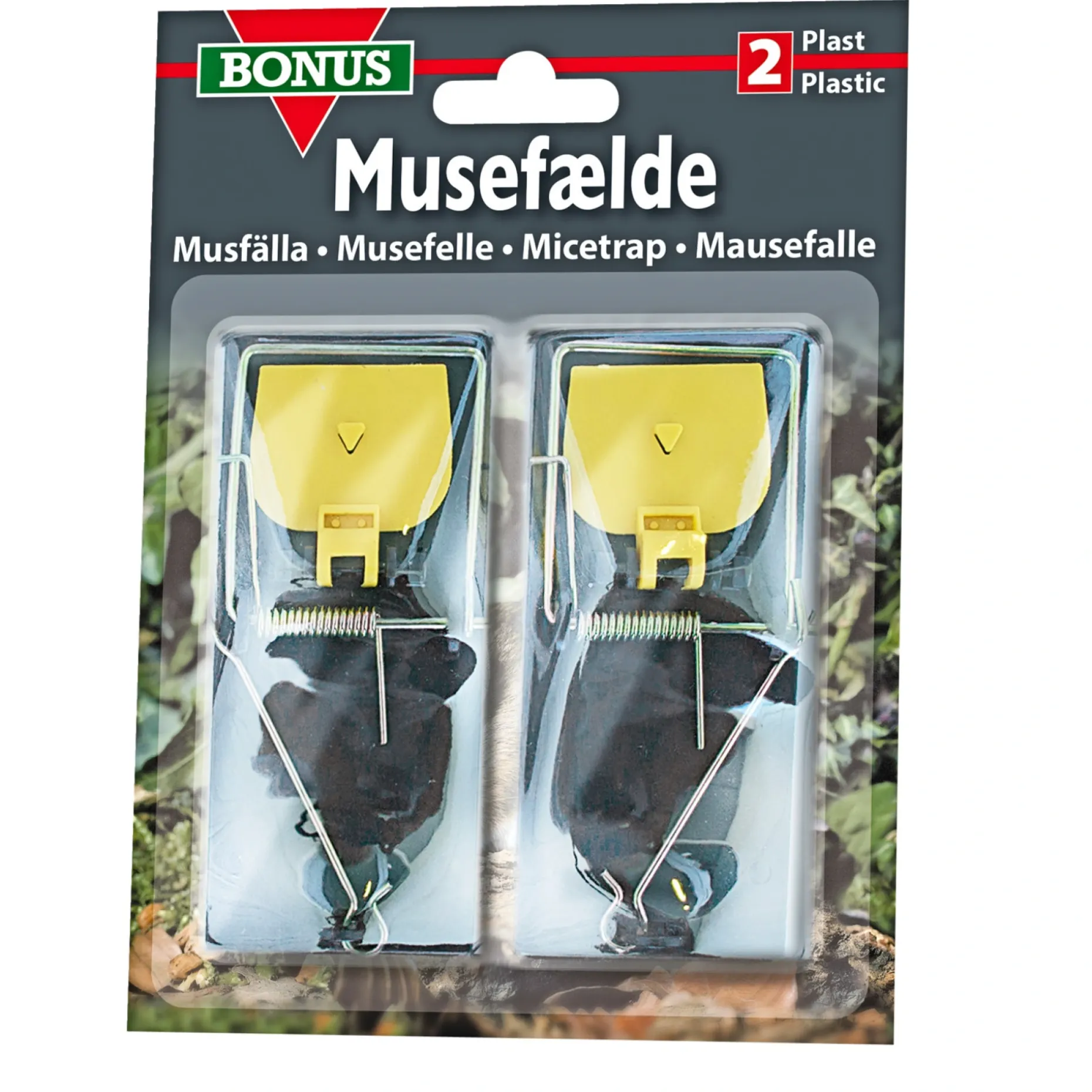 Smækfælde i plast leveres som en pakke med 2 stk. Produktet er dyreetisk udført og er udstyret med enkelfjeder samt en ekstra stor holder til lokkemiddel. Holderens størrelse gør det lettere at placere lokkemidlet præcist og øger chancen for kontakt fra mus.