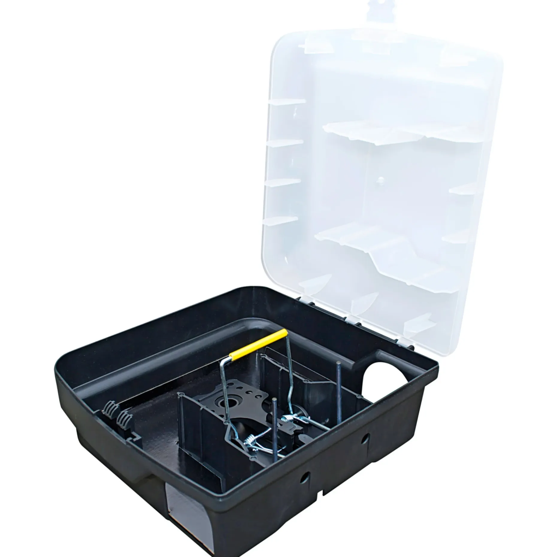 Med ekstra stærk smækfælde. Låg kan låses så børn og husdyr ikke kan komme til fælden.