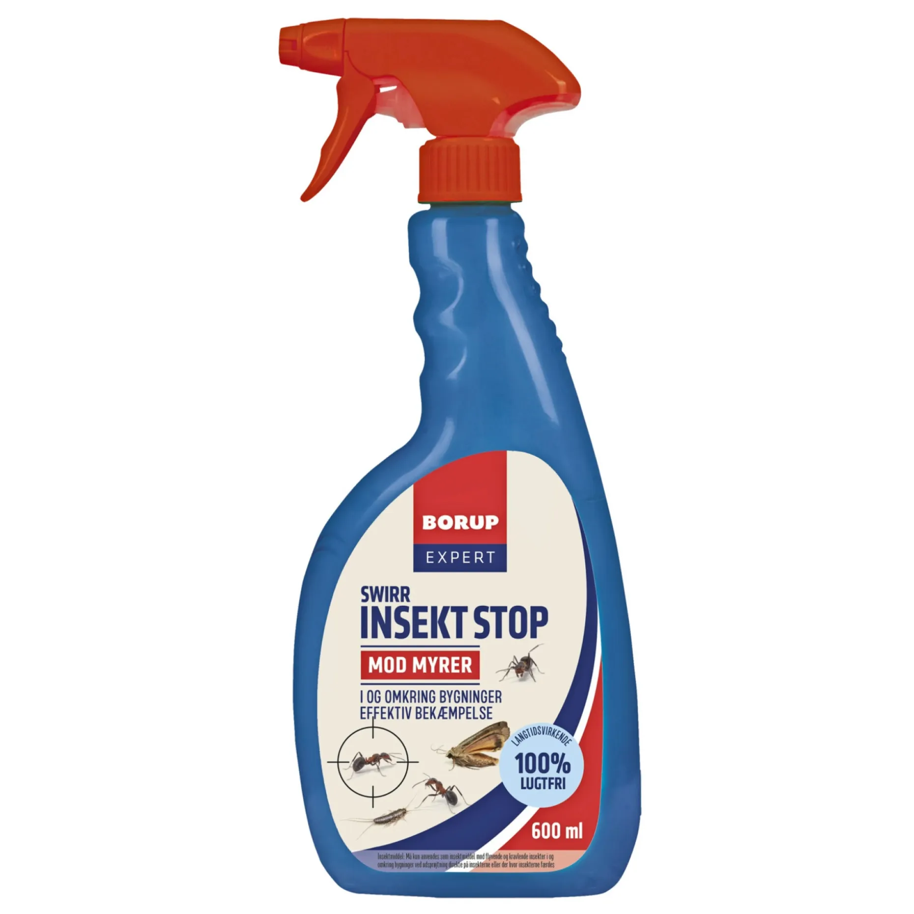 Borup Expert Insekt Stop 600ML er til effektiv bekæmpelse af myrer og andre krybende insekter. Produktet kan anvendes i stuen, badeværelset eller udendørs på terrassen. Det er velegnet ved synlige myrestier eller ved konstateret forekomst af krybende insekter i bolig- og udeområder.
