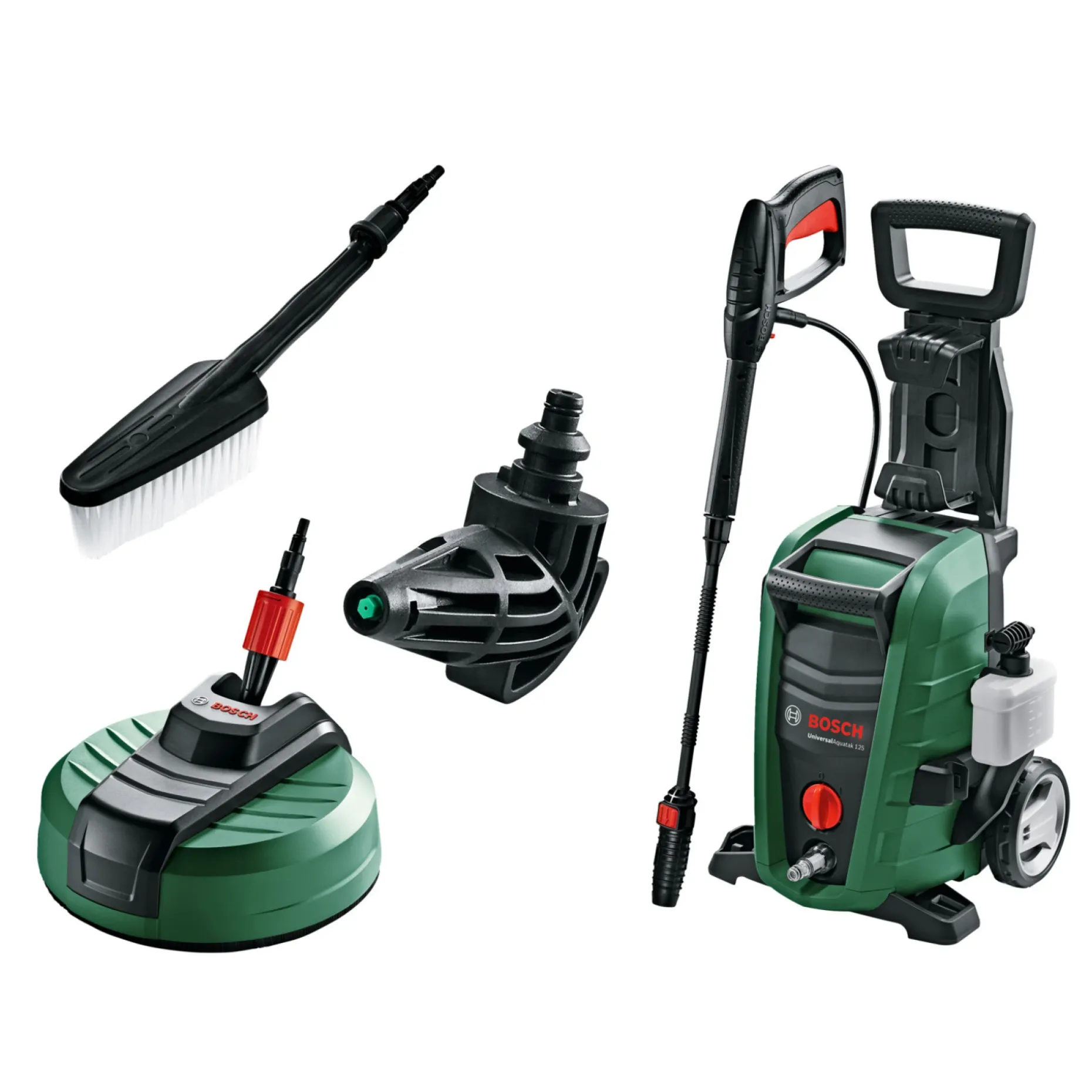 Bosch Aquatak Home & Car Kit er en alsidig højtryksrenser til rengøring af bil, terrasse, havemøbler og tagrender. Med 125 bar arbejdstryk og en vandmængde på 360 l/time leverer den effektiv fjernelse af snavs og grønne belægninger uden unødige lange arbejdsgange.
