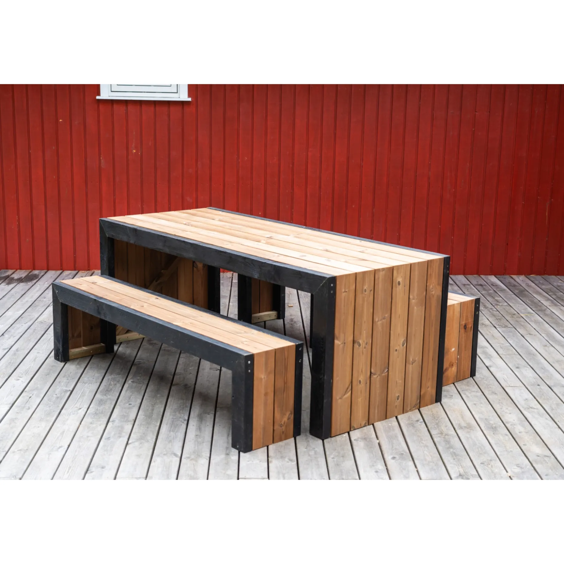 Vi prioriterer både holdbarhed og æstetik. Derfor er stellet fremstillet af trykimprægneret træ, som males i en sort farve, som også følger med sættet, mens siderne på bord og bænke samt bordpladen og sæderne laves af varmebehandlet thermotræ, der sikrer langvarig holdbarhed i det nordiske klima.
