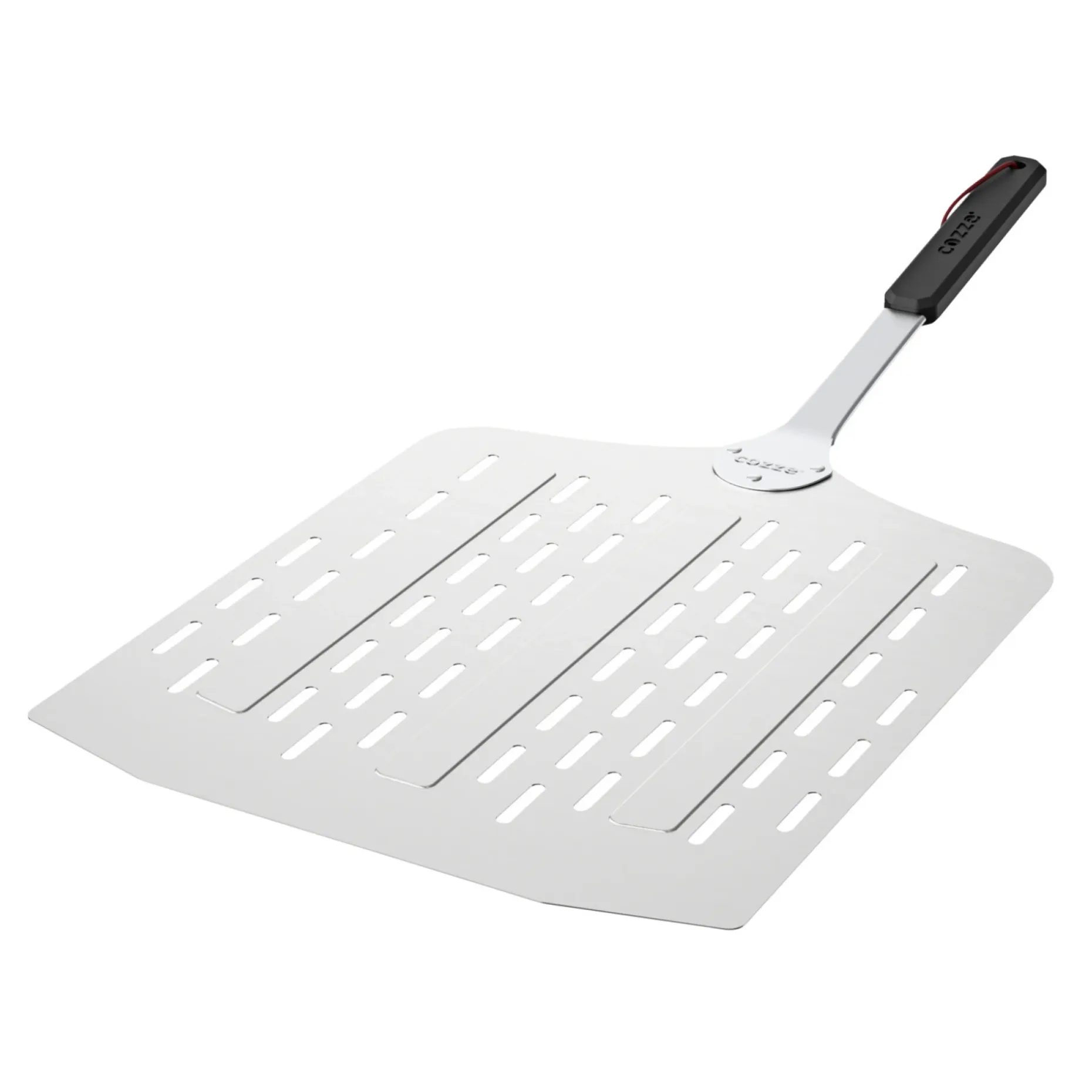 En pizzaspade er et næsten uundværligt redskab ved pizzabagning. Den perforerede plade i aluminium gør, at størstedelen af pizzamelet drysser igennem, inden pizzaen rammer ovnen, så melet ikke brænder fast. Det giver mindre røg, mindre rengøring og sprøde pizzaer. Softgrebet sikrer komfort ved brug, og pizzaspaden har læderstrop til ophængning.
