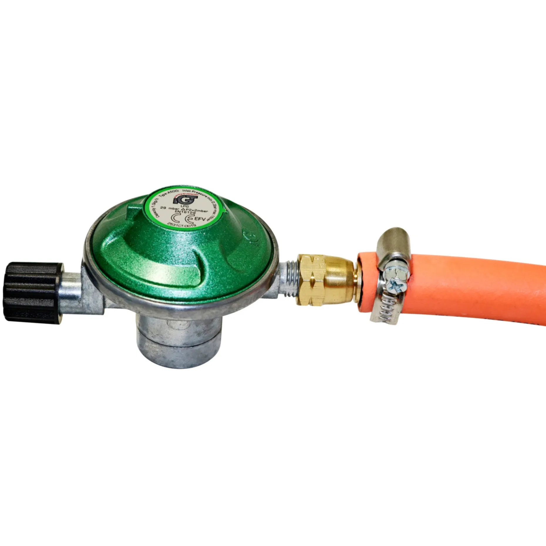 GT Regulator A500IS-P142 indgår som regulatorenhed i sættet og leveres sammen med slange og spændebånd. CE-godkendelsen dokumenterer overholdelse af EN 16129 og bidrager til produktets tryghed.