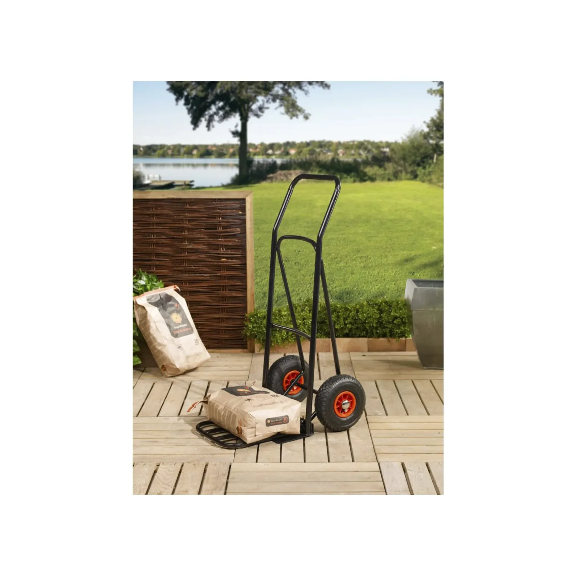 Sort sækkevogn med to 10″ luftgummihjul og bøjlegreb. Velegnet til transport af sække og tungt materiale ved gør‑det‑selv-projekter, havearbejde og mindre byggeopgaver.