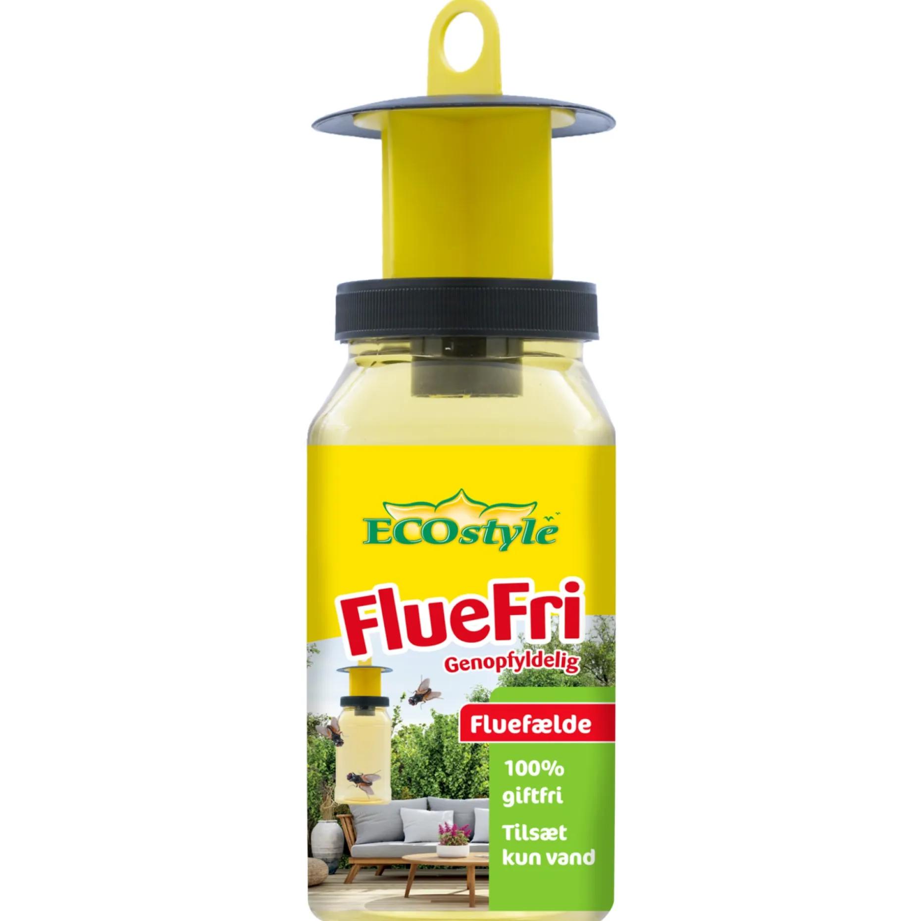 Ecostyle FlueFri er en genopfyldelig fluefælde, der er 100 % giftfri og leveres med effektivt lokkemiddel.