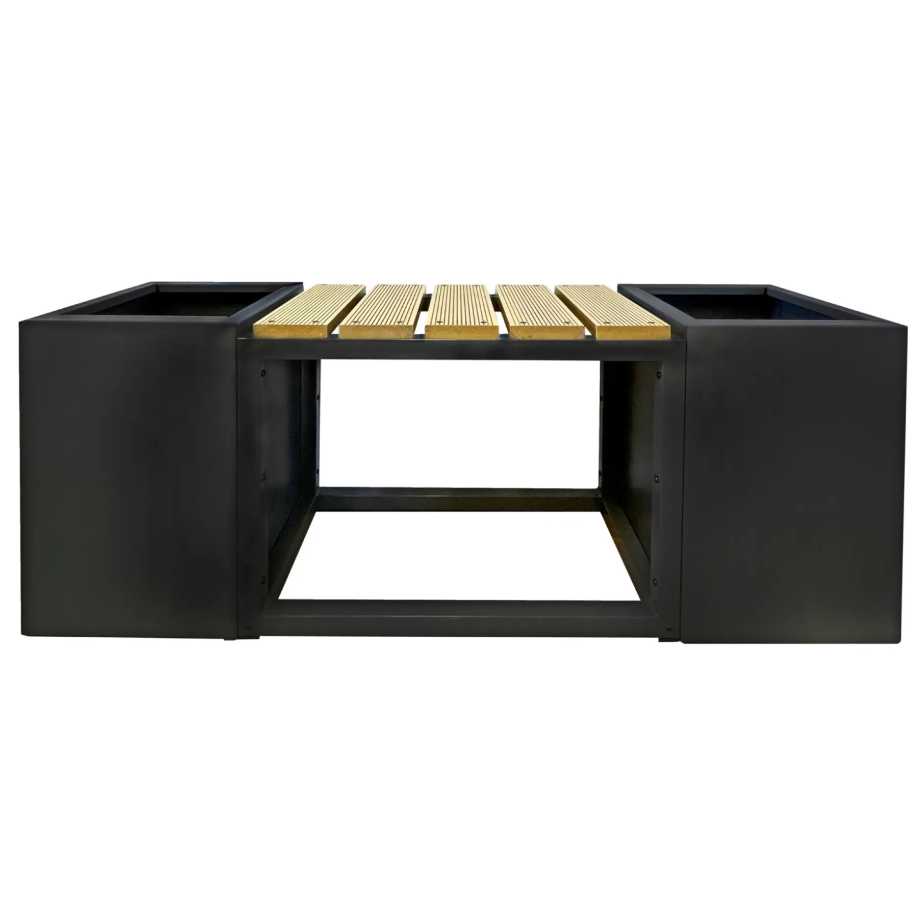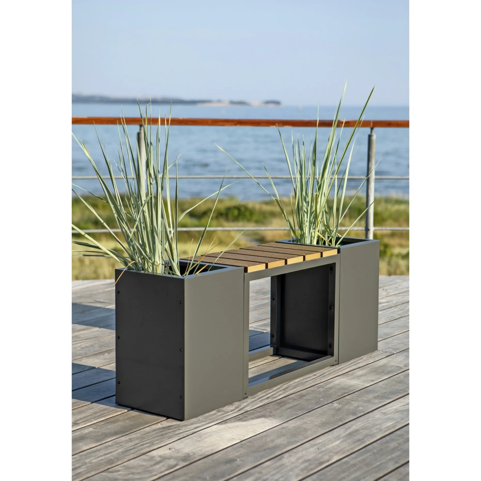 De to plantekasser gør det enkelt at tilføje blomster eller krydderurter ved siddepladsen, hvilket skaber en indbydende atmosfære. Konstruktionen kombinerer funktionalitet og æstetik, så bænken både fungerer som siddeplads og som dekorativ planteenhed.