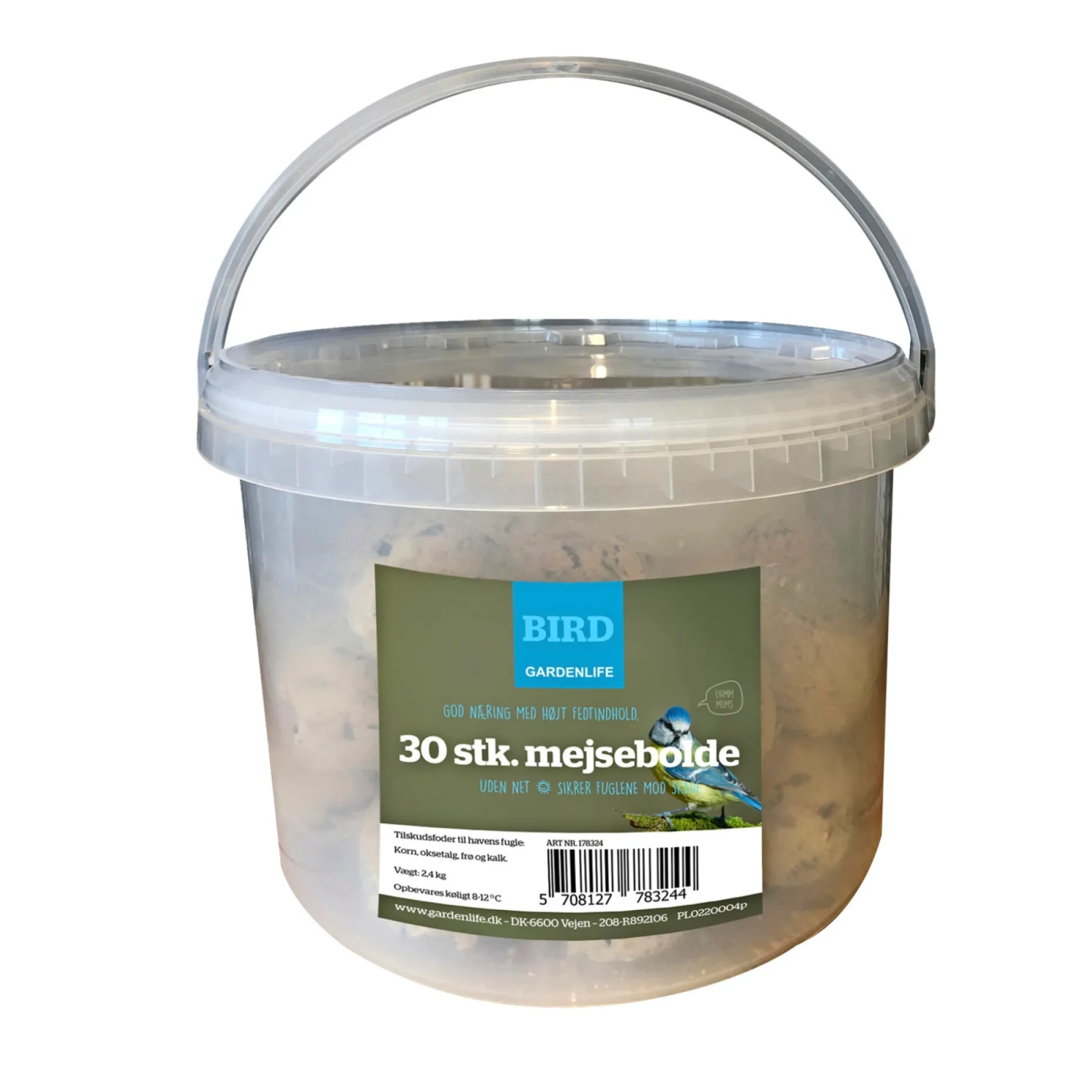 Pakken indeholder 30 mejsebolde i net i en praktisk spand, hvilket gør opbevaring og håndtering mere overskuelig. Den klare spand gør det også visuelt enkelt at se, når der skal suppleres.