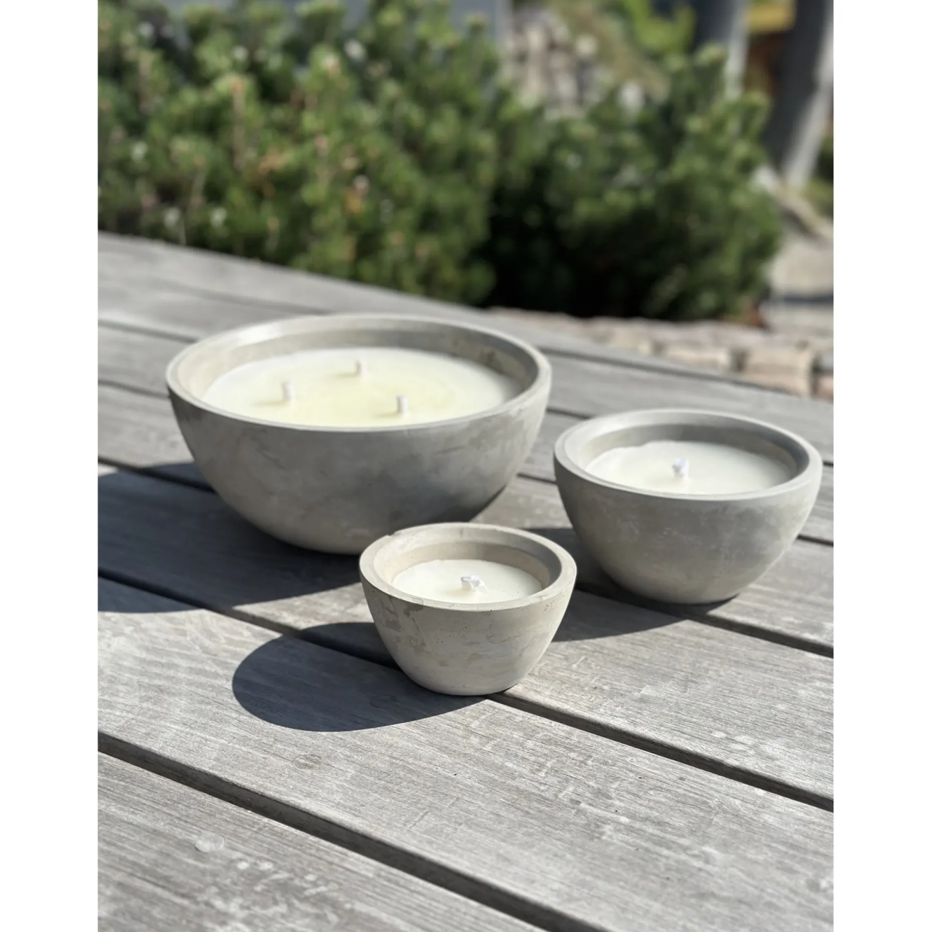 Citronella stearinlys i betonkrukke med låg, str. S. Lyset har en betonbeholder i grå nuance og en brændetid på ca. 8 timer. Produktet er beregnet til udendørs brug og leveres i en enkelt enhed. Det mindste lys på billedet svarer til dette varenummer. Lyset fås i flere størrelser og sælges fra 59,-.