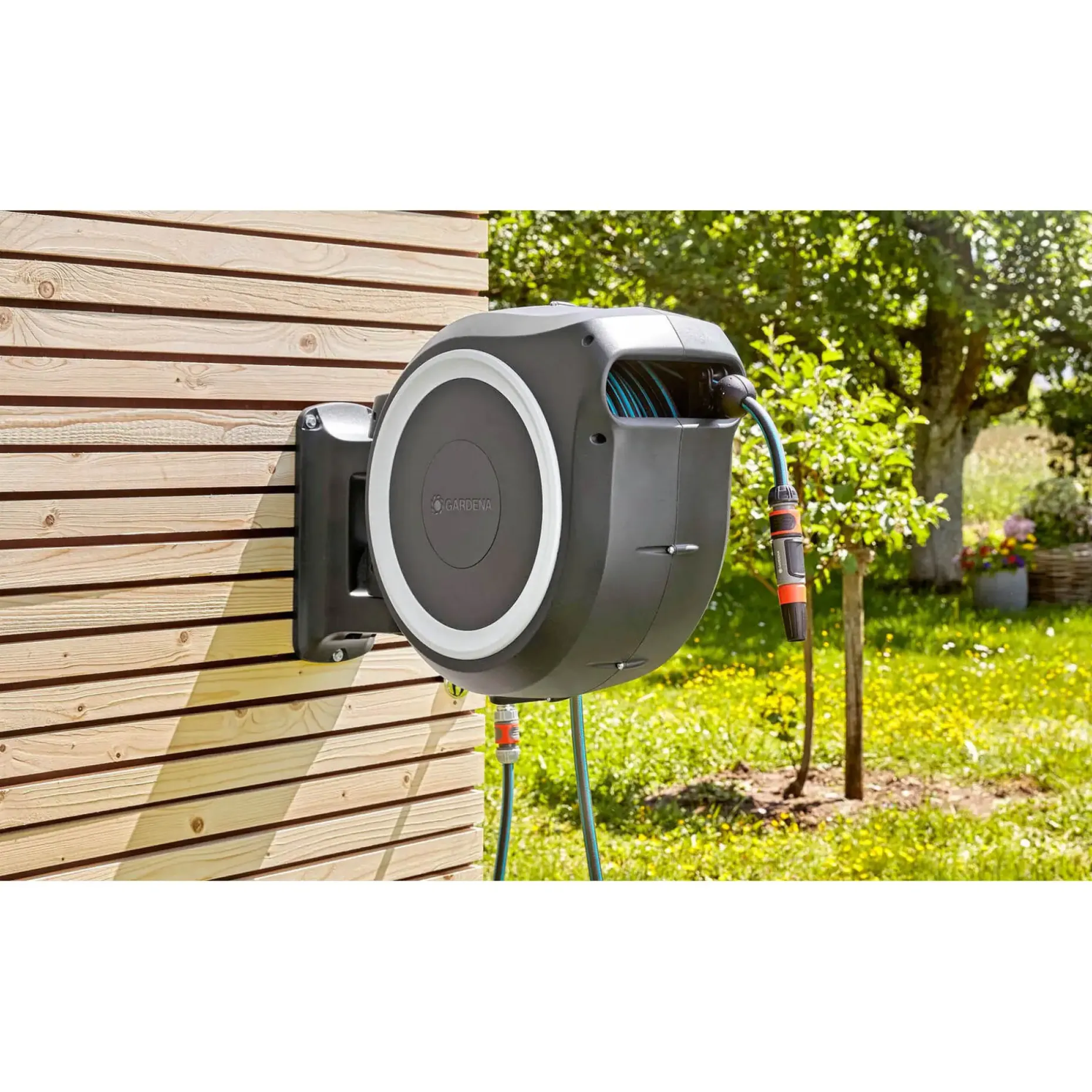 Den vægmonterede løsning ruller automatisk en 30 meter haveslange op ved hjælp af en integreret stålfjeder, så du undgår sammenfiltring og beskidte hænder.