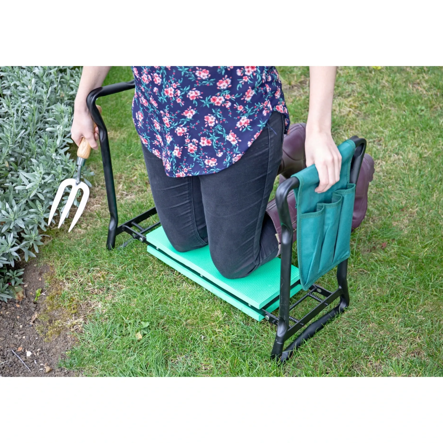 Produktet reducerer belastning på knæ og ryg ved havearbejde ved at lade dig skifte mellem at sidde og arbejde i knæ. Den sammenklappelige konstruktion gør den nem at tage med, så du hurtigt kan fortsætte arbejdet uden at lede efter siddeplads.