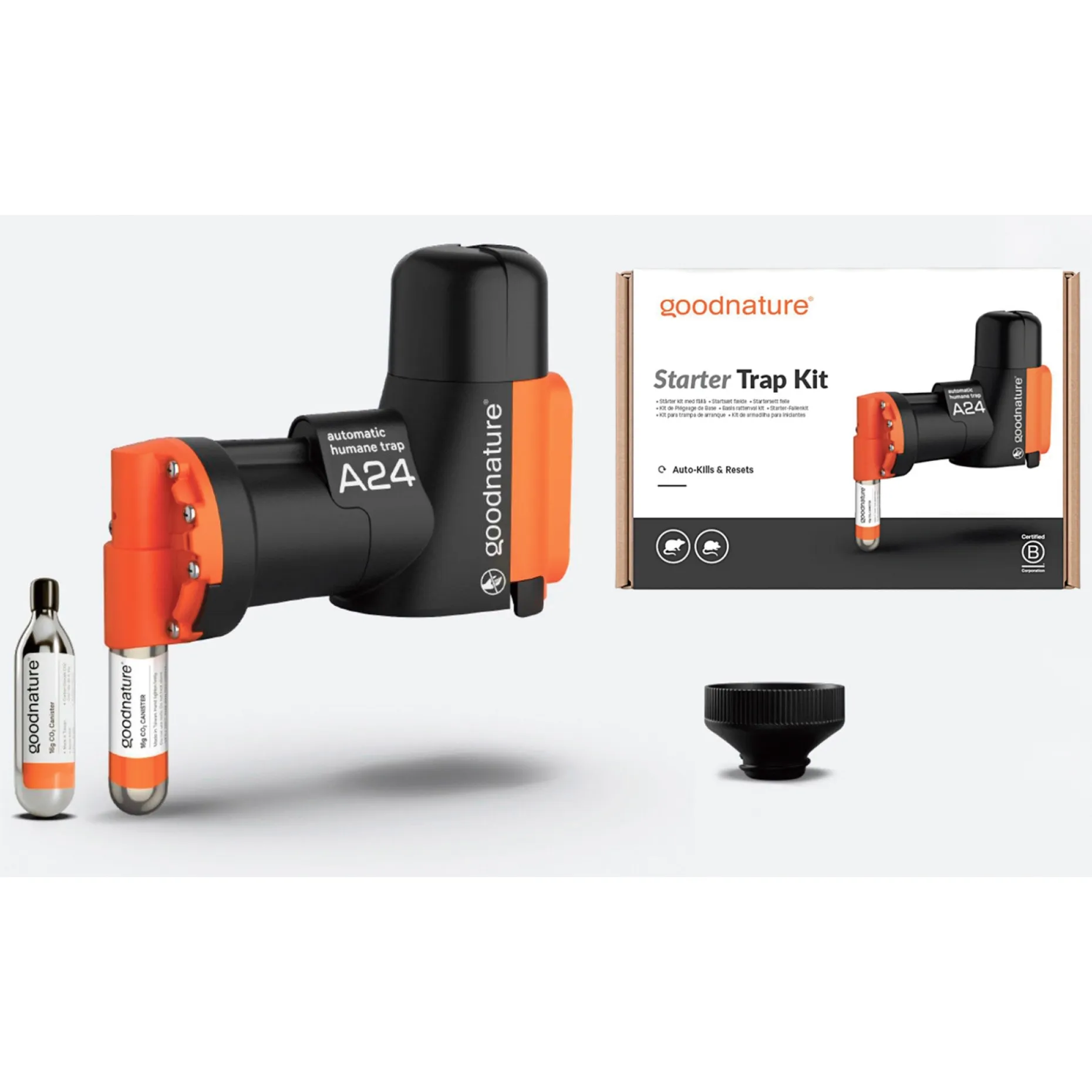 Goodnatures® Start fælde, der hurtigt og smertefrit bekæmper rotter og mus. Når fælden går af, falder skadedyrene ned på jorden, og fælden genlader automatisk sig selv op til 24 gange. Det betyder, at du kan fange flere rotter eller mus uden at skulle genlade fælden manuelt. Når fælden er opsat udenfor, kan de døde skadedyr blive spist af andre dyr.