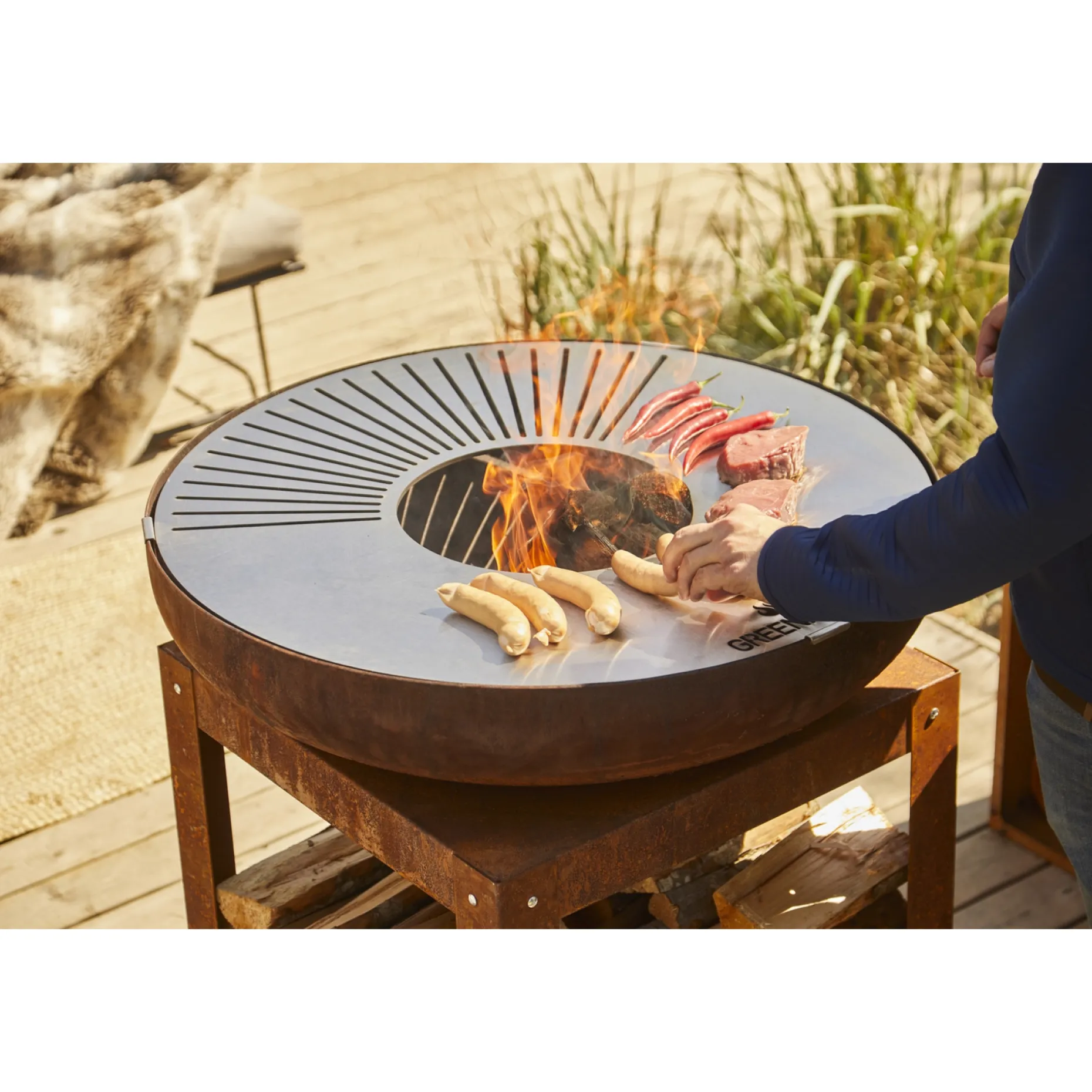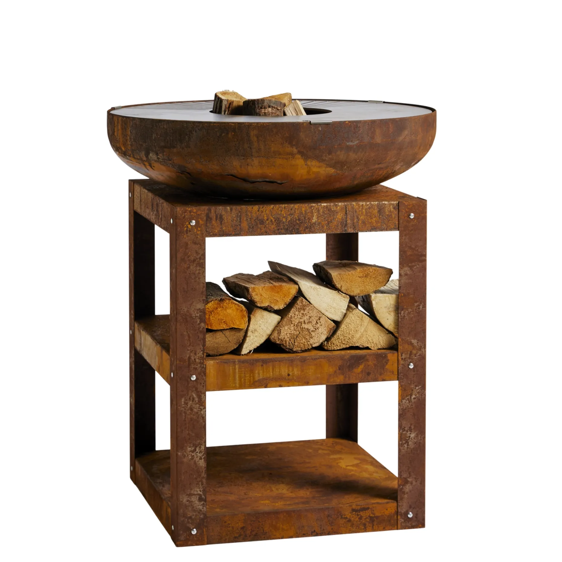 Det robuste, høje bålfad i stål har et elegant rustlook og giver rammen om grillning, stegning og ristning over åben ild.