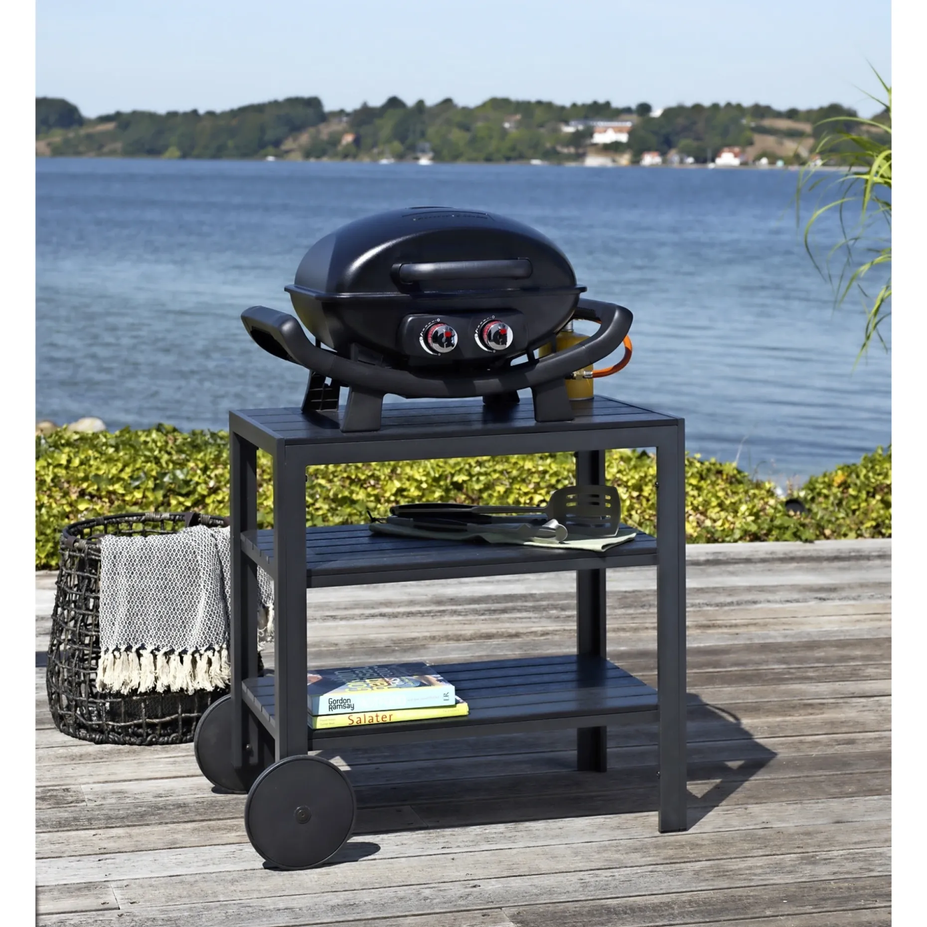 Smart serveringsvogn med bordplade og 2 hylder, designet til at holde din Handy grill i en behagelig arbejdshøjde. Hylderne giver plads til tallerkener, grillredskaber og tilbehør, så du har det vigtigste samlet ved siden af grillen.