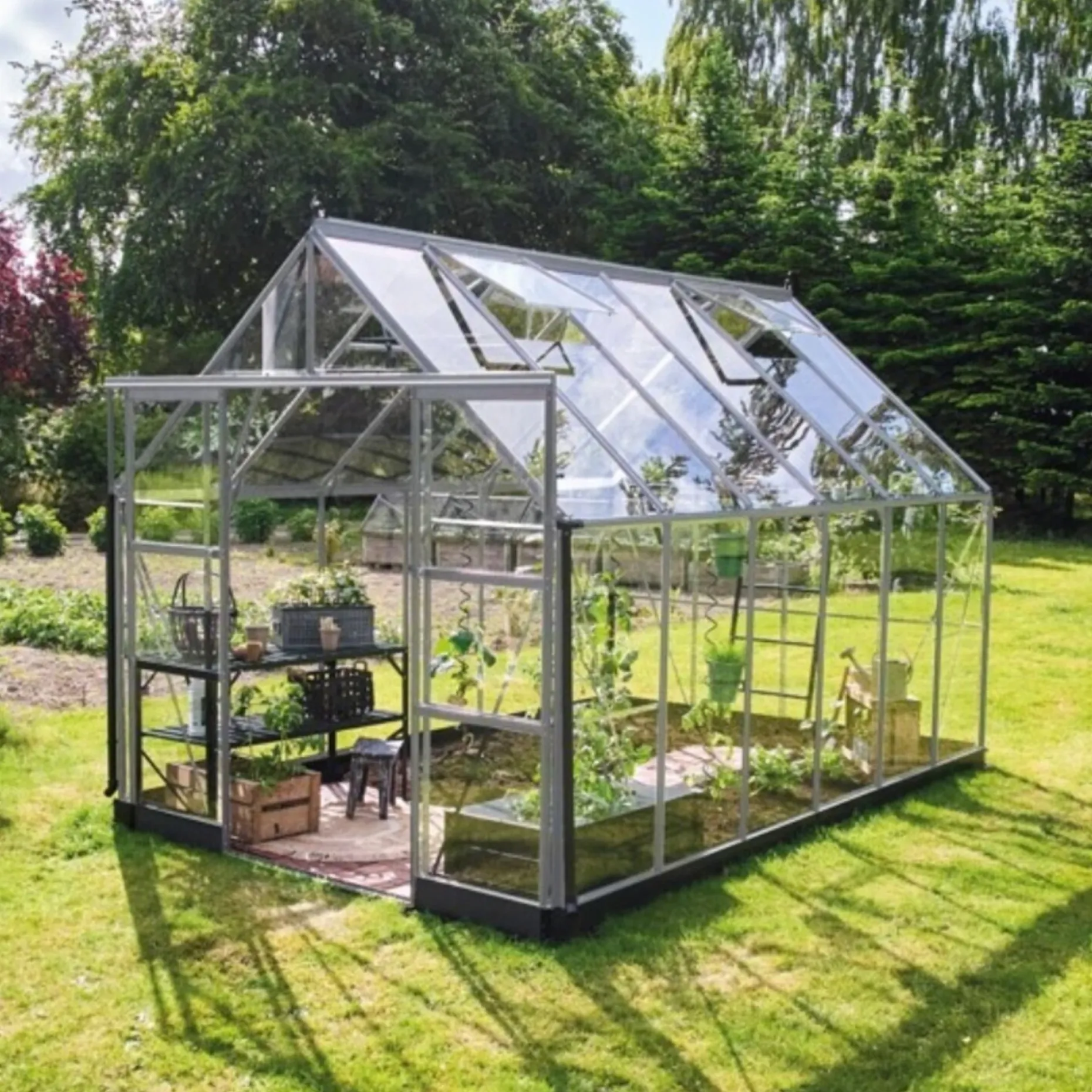 Den stabile konstruktion af aluminiumsprofiler gør det langtidsholdbart, mens de brede dobbeltskydedøre med lav dørtrin giver en komfortabel adgang – også med trillebør eller større plantekasser.