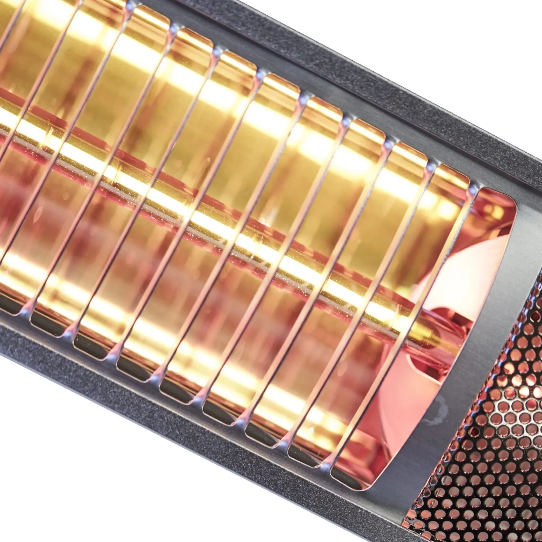 Væghængt infrarød kortbølge terrasevarmer i smart design, der er ideel til montering under markiser og tagudhæng. 92 % af energien konverteres til varme og giver rigeligt varme til de personer, der sidder inden for en afstand af 3 meter fra varmeren.