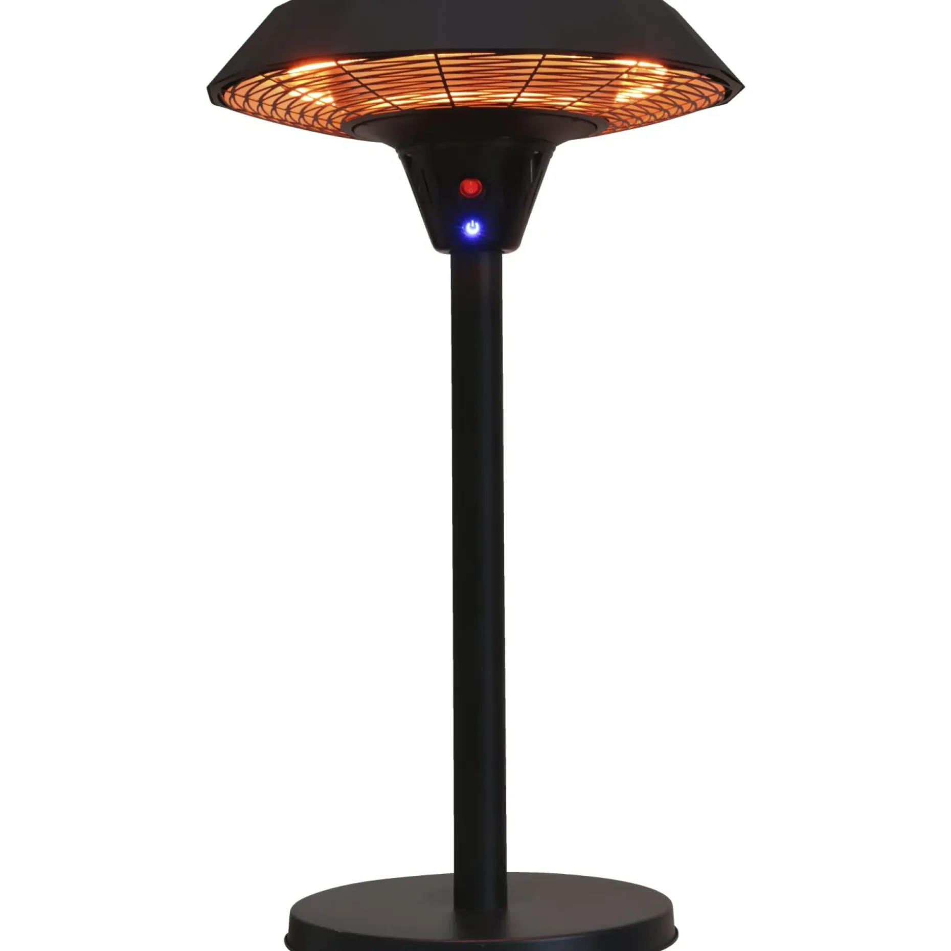 80% af energien i denne HORTUS terrassevarmer model “UFO” bordmodel konverteres til varme og giver rigeligt varme til de personer, der sidder omkring bordet. 3 effekttrin 800/1200/2000W infrarød halogenrør med en levetid på minimum 5000 timer. Soft touch tænd/sluk knap. Inklusiv fjernbetjening