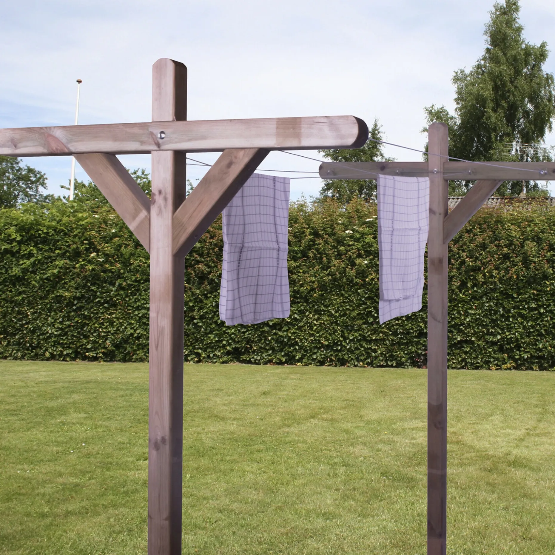 HORTUS tørrestativ giver en enkel og holdbar løsning til udendørs tøjtørring. Det er fremstillet i trykimprægneret 70×70 mm fyrretræ og leveres umalet i natur. Med 20 meter plastbelagt wire kan du hænge vasketøj op i fuld længde uden at bruge tørretumbler, hvilket giver friskere tekstiler og reducerer energiforbruget. Stolperne er 270 cm lange og beregnet til nedgravning eller nedstøbning, så stativet står stabilt i havens jord. Produktet leveres komplet med de nødvendige dele til montering og anvendelse. Inkluderede elementer gør det hurtigt at få stativet op at stå, og den medfølgende samlevejledning forklarer trin for trin. Materialets trykimprægnering øger modstandsdygtigheden overfor vind og vejr, så stativet kræver minimal overfladebehandling sammenlignet med ubehandlet træ. At tørre tøj udendørs gør tøjet friskere og kan reducere brugen af tørretumbler. Trykimprægneret træ gør stativet modstandsdygtigt overfor råd, svamp og insektangreb, så det bevarer stabilitet og udseende i mange sæsoner uden omfattende overfladebehandling.