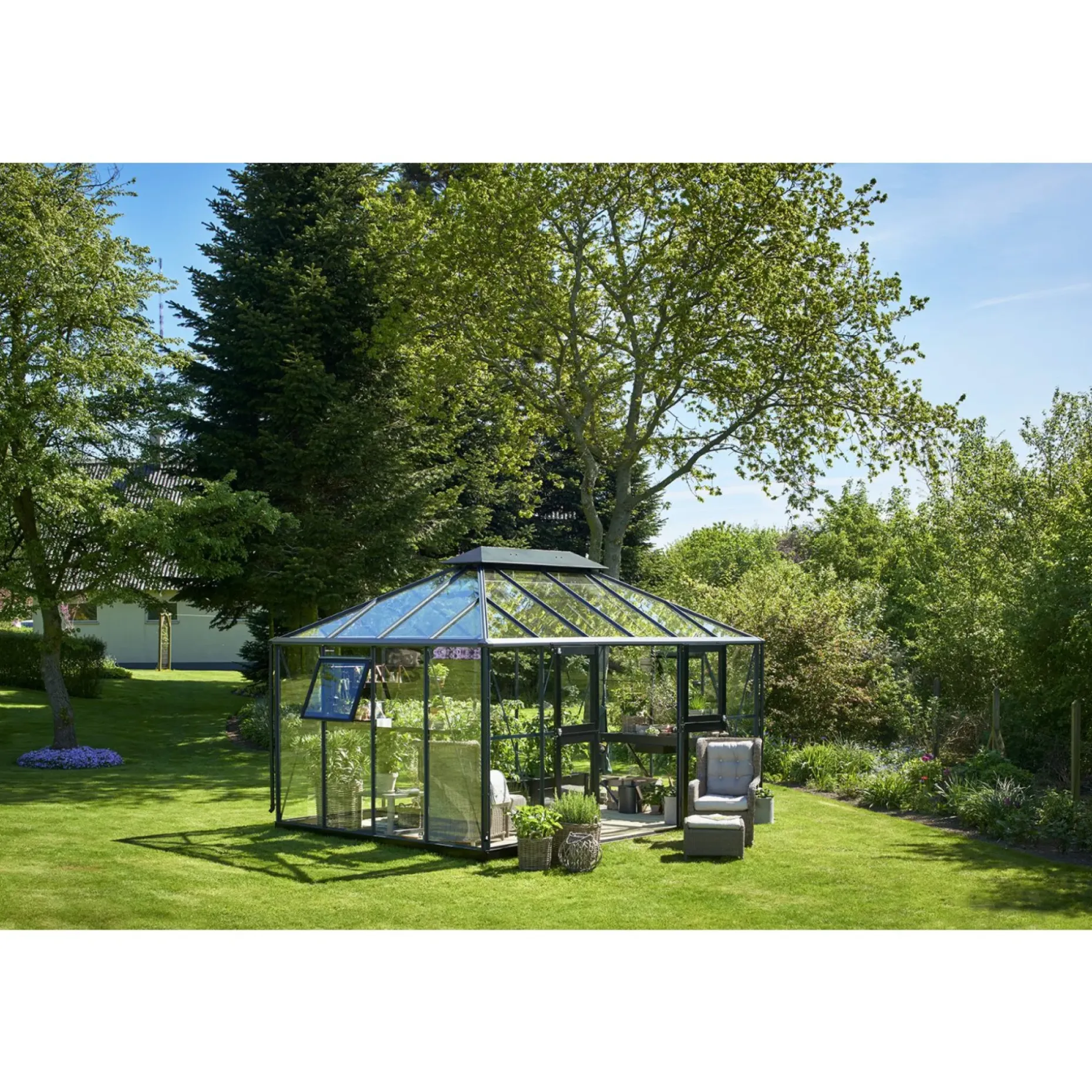 Dette drivhus passer til en rigtig drivhus-entusiast. Der er plads til hele familiens planteprojekter, som dyrkning af krydderurter, frugt og grønt. Samtidig er der også plads til at have bord og stole, hvis dette ønskes.