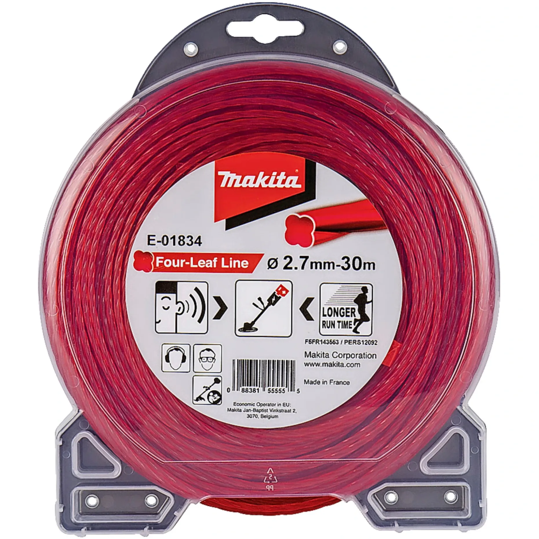 MAKITA FOUR-LEAF E-01834 rød trimmertråd er en kløverformet nylontråd designet til effektiv græsklipning og beskæring. Trådens firkantede profil giver mindre støj og lavere energiforbrug, hvilket gør den særligt velegnet til akku-trimmere. Produktet fås som 2.7-30M og leverer en mere stabil skæreeffekt end almindelig rund tråd.