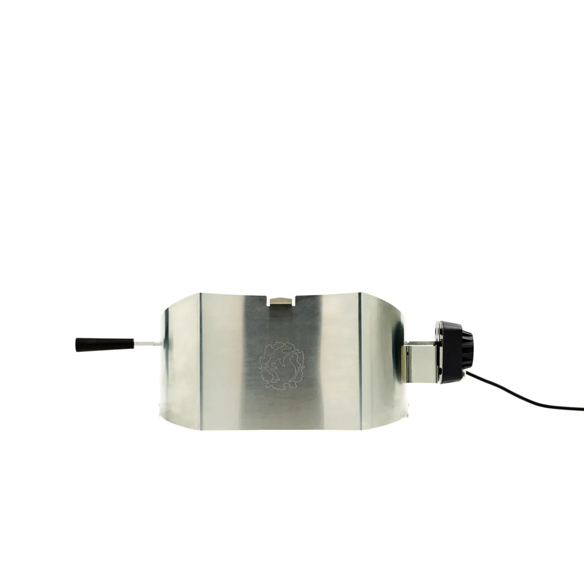Rotisseri med buet skærm i rustfrit stål, som giver god plads til at rotere selv store stege eller hele kyllinger. Der er plads til at placere en saftopsamler mellem det roterende spyd og grilllegemet, så saft opsamles under stegningen.
