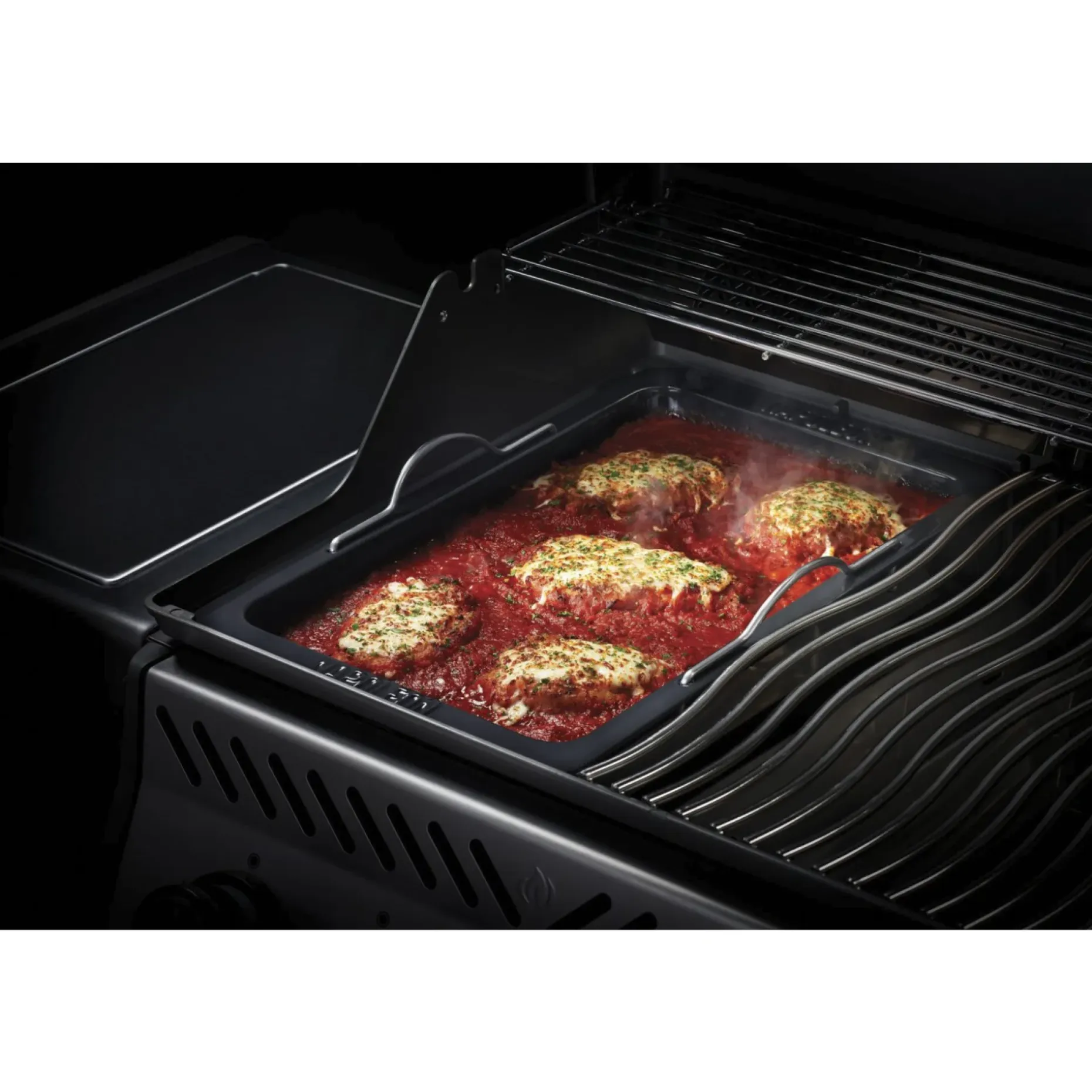 Bradepanden fra Napoleon er et lækkert grilltilbehør, der sikrer flere anvendelsesmuligheder til grillen. Fjern grillristene og placer bradepanden direkte i grillen som en drop-in emaljeret løsning i sort.