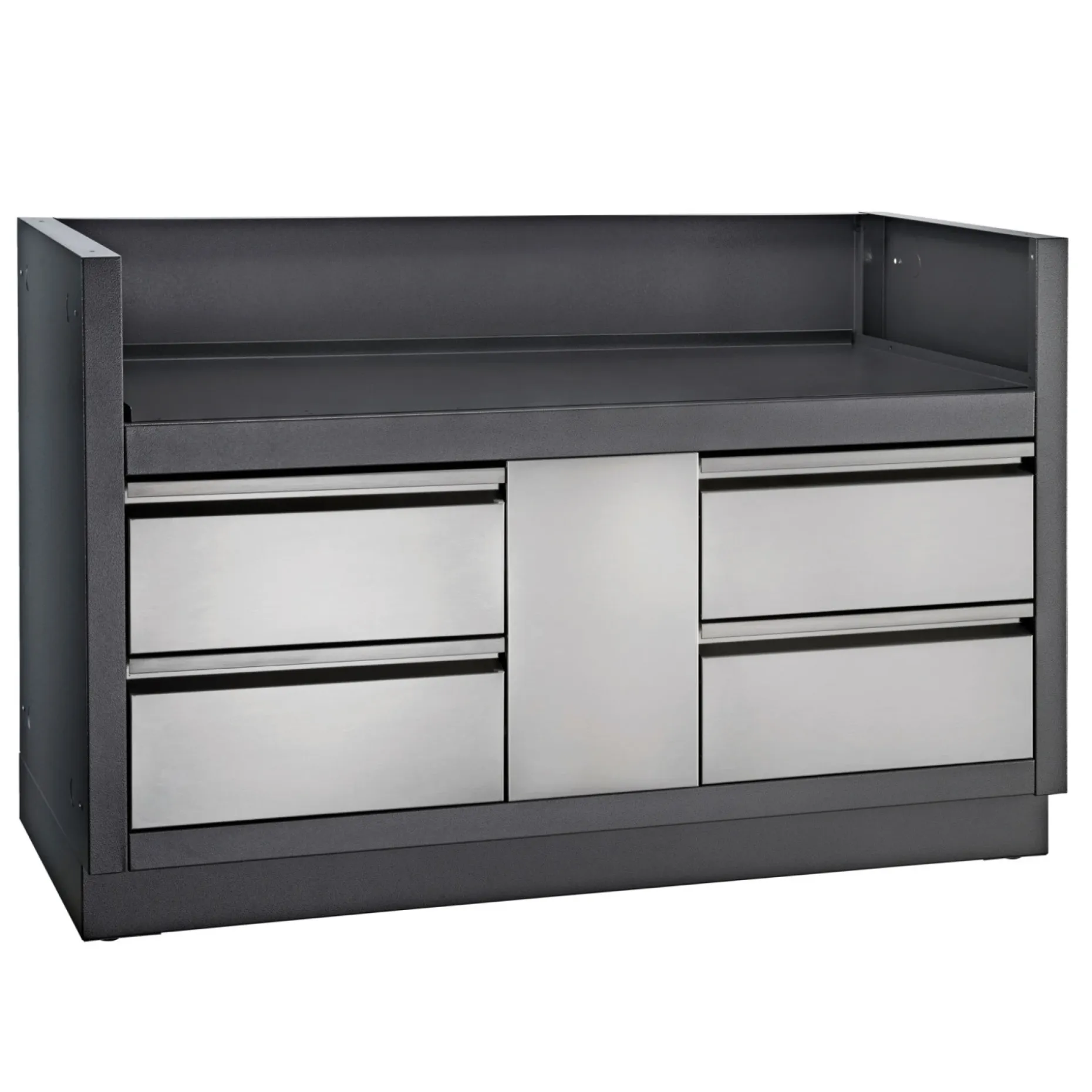 Napoleons underskab til Prestige Pro825 (Built-in PRO 825) er et færdigmonteret underskabsmodul i grå hammerlak med fire skuffer i 304 rustfrit stål. To brede skuffer giver plads til viskestykker, grilltang, rotisseri og pizzasten, så du har organiseret opbevaring ved grillen.