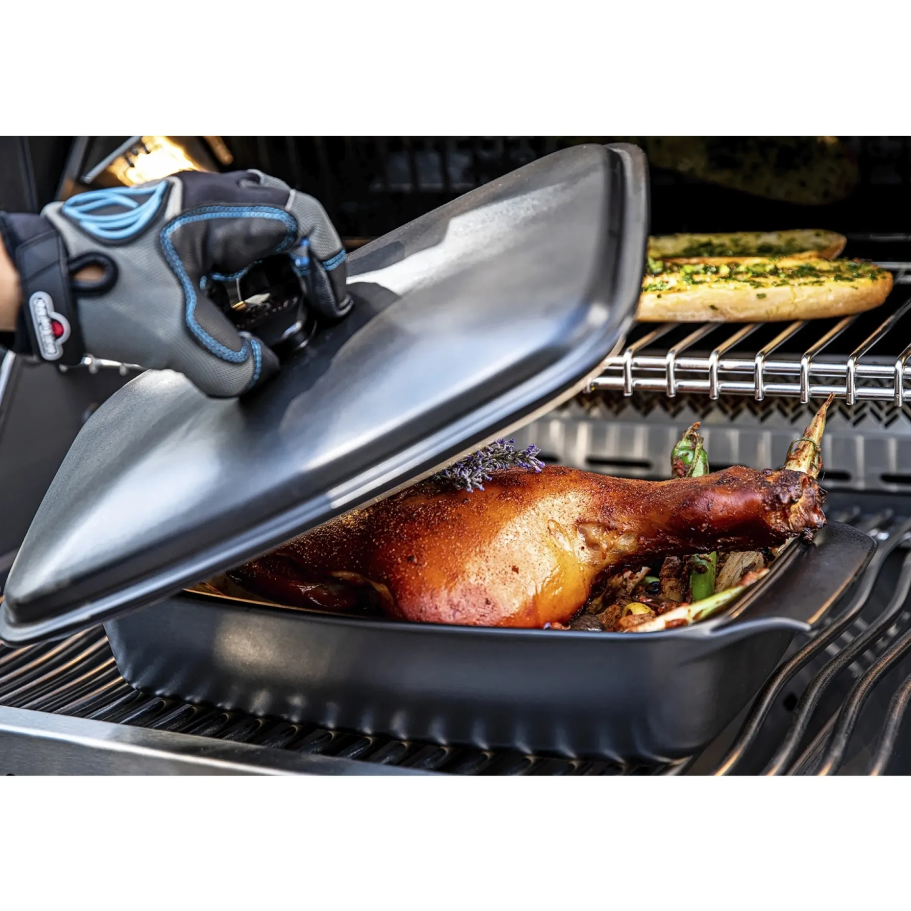 Fadet har et solidt låg samt store håndtag, så du nemt kan tage fadet ind og ud af grillen. Den jævne varmefordeling gør fadet velegnet til langsom tilberedning, hvor saft og smag bevares.