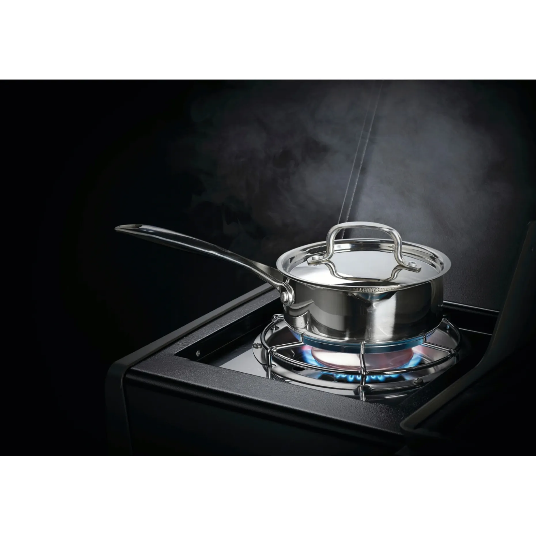 Sidebordene kan foldes ned, så grillen passer til små terrasser og altaner, og underskabet kan rumme en 10 kg gasflaske. Grillen har et dobbeltvægget låg, integreret ACCU-PROBE™ termometer og en stor varmehylde i rustfrit stål for fleksibel tilberedning.