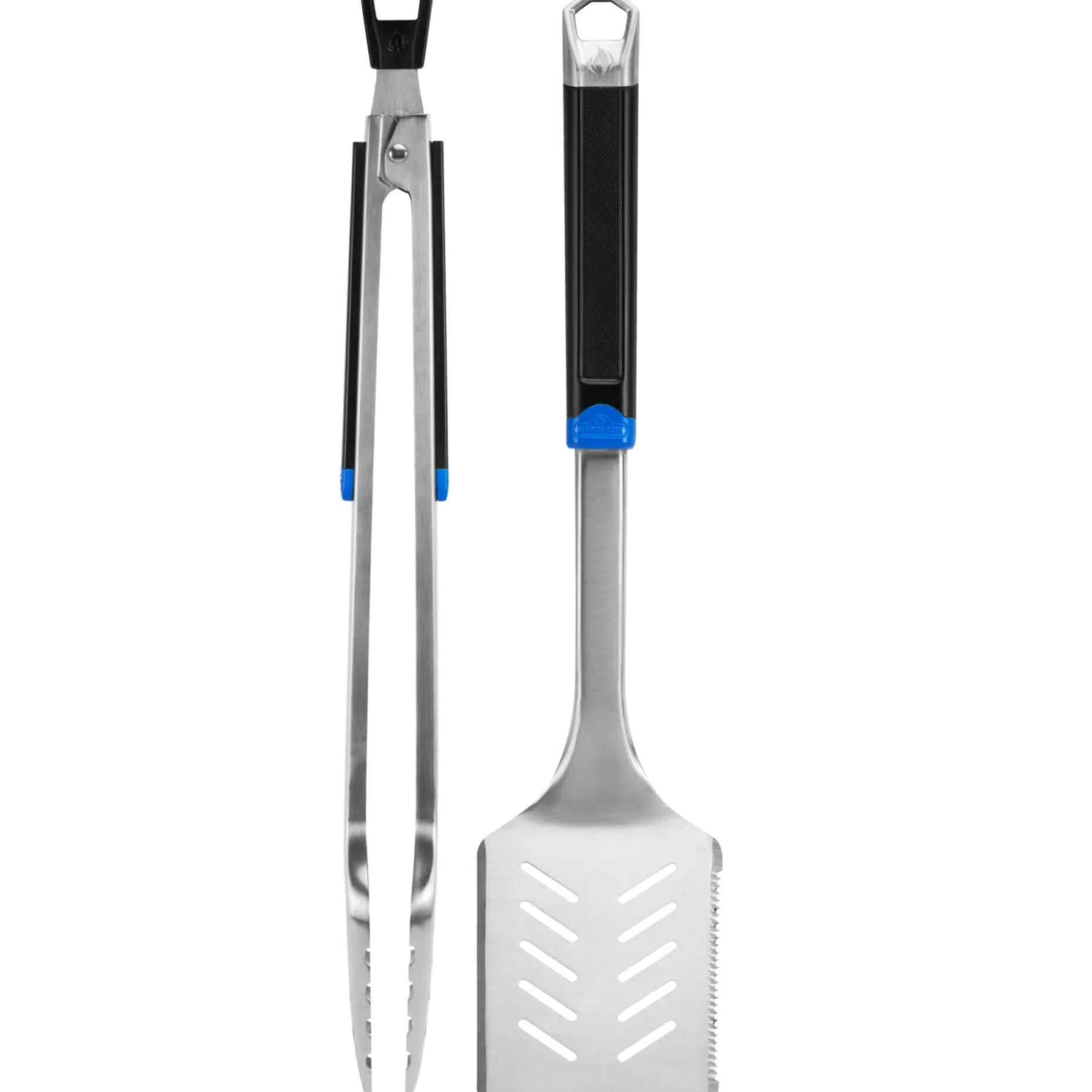 Redskabssæt med tang og palet fremstillet i holdbart rustfrit stål. Paletten har et ekstra langt håndtag og en praktisk savtakket kant, der gør det nemt at vende burgere, grøntsager, fisk og større stykker kød. Tangen har en smart låsemekanisme, så den er nem at håndtere og kan forblive lukket under opbevaring. Begge redskaber er udstyret med soft-touch håndtag for et behageligt og sikkert greb under brug. Sættet har desuden ophængsløkker, så redskaberne kan hænges op tæt på grillen og altid være inden for rækkevidde. Kombinationen af rustfrit stål og soft-touch håndtag giver en robust løsning, der er beregnet til gentagen brug ved udendørs madlavning og gør det lettere at håndtere varme råvarer uden at miste kontrollen. Det ekstra lange håndtag på paletten giver dig god afstand til varmen, så du kan arbejde sikkert ved grillen. Rustfrit stål betyder nem rengøring og høj modstandsdygtighed over for hyppig brug. Soft-touch håndtagene sikrer et stabilt greb, også når redskaberne er varme eller fedtede. Sættet er ideelt til både små og store grillprojekter.