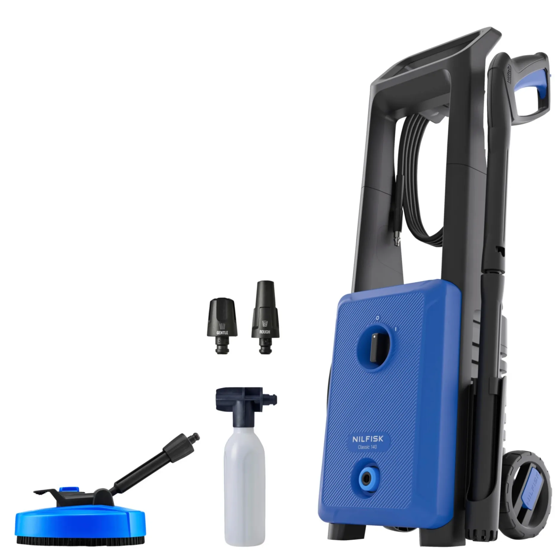 Højtryksrenser til medium svære rengøringsopgaver omkring dit hjem. Classic 140-6 P. Bar, max.: 140 bar. Vandmængde, max.: 462 l/time. Kompakt højtryksrenser med mange integrerede funktioner. Opretstående ergonomisk design. Driftssikker metalpumpe og universalmotor. Automatisk start/stop. Nem at betjene. Brugerguide til optimal rengøring. Nem at opbevare og transportere. Integreret kørevogn. Click & Clean tilbehørssystem. Spulehåndtag m. lynkobling og drejefunktion af slange. Holdere til spulehåndtag, dyserør, dyser, skumsprayer og elkabel. Smart holder til ULTRA FLEX højtryksslangen. Standardtilbehør: 6 m ULTRA FLEX højtryksslange m. lynkobling; C & C Gentle dyse; C & C Rough dyse; C & C Skumsprayer + dunk; Patio terrassevasker.
